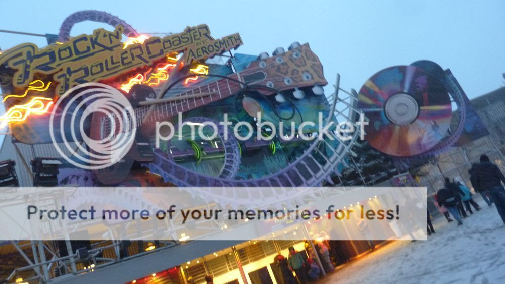 There we go, starting with the Rock and Roller Coaster facade - picture above - hiding in fact an industrial building with the coaster in it. Right in front of the Blockbuster Cafe - formerly Backlot Express - a New York yellow cab, snow include - but the snow is not coming from New York!