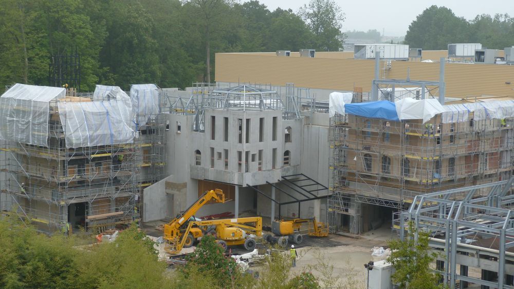 Below, the restaurant building, note on the top of the right part ( not themed yet with fake facades ) the rounded metallic structure which is here for the upcoming verandah.