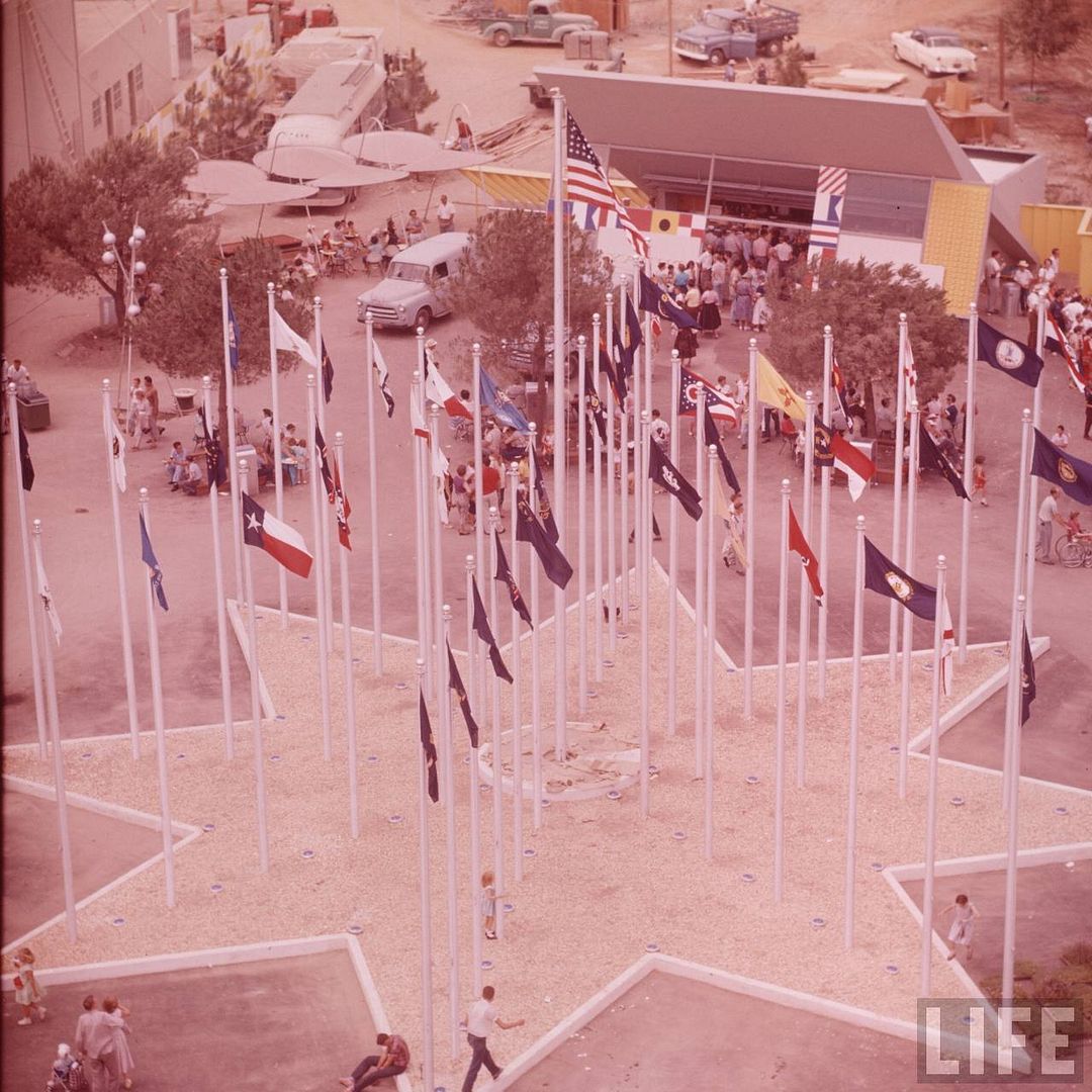 At Disneyland opening day the "Flags of theNations" were located in the back of Tomorrowland near the TWA Rocket. they will move to the entrance of the land in 1956.