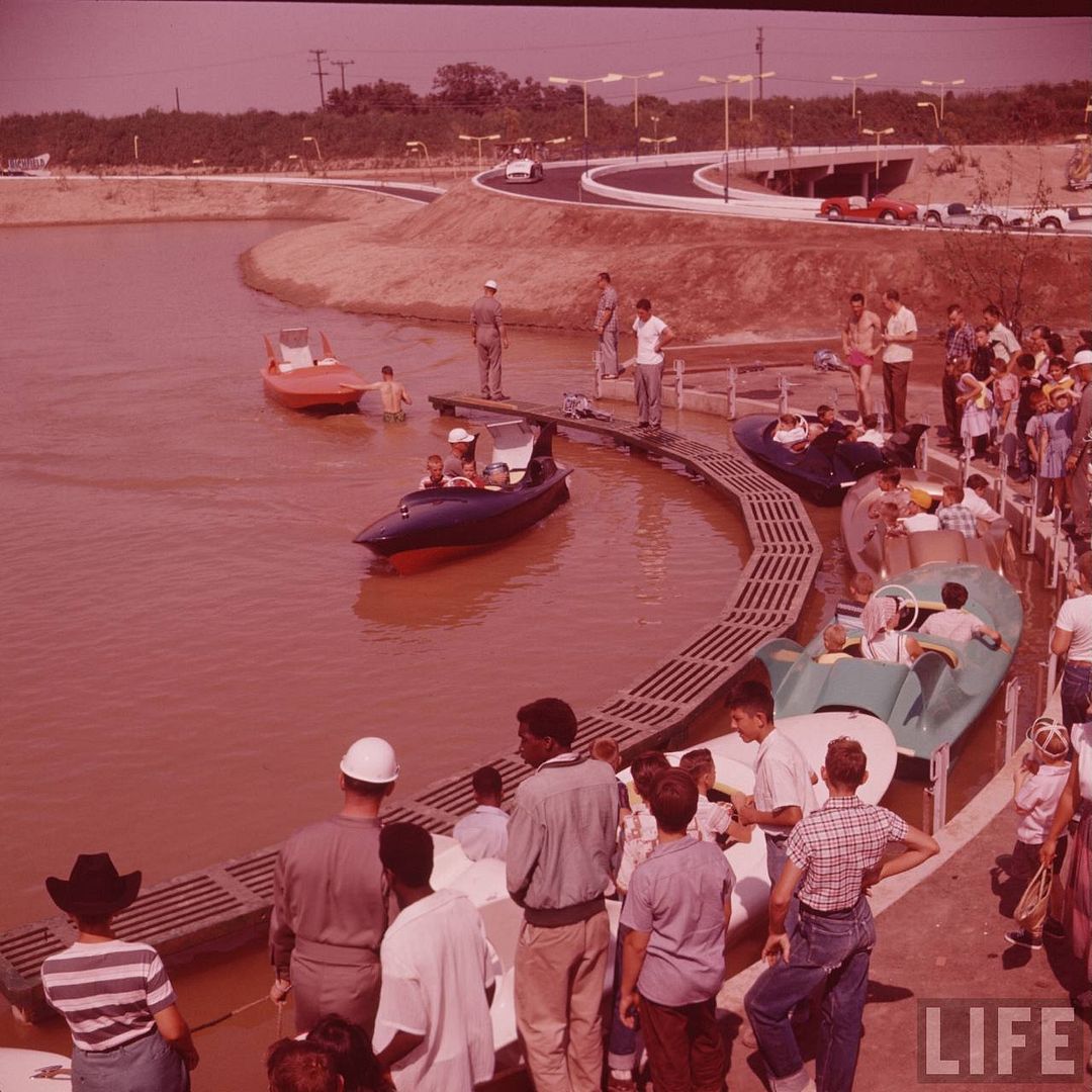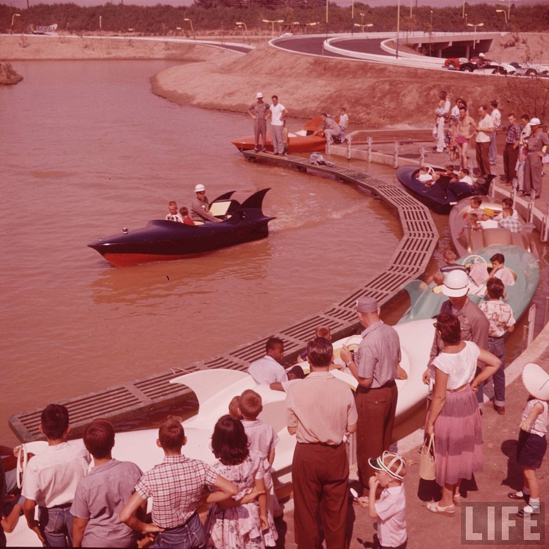 And not far from Autopia were the Tomorrowland boats which will be renamed "Phantom boats" in 1956. Apparently the boat engines were unreliable, and the Phantom Boats became later the first permanent attraction to be removed from Disneyland.