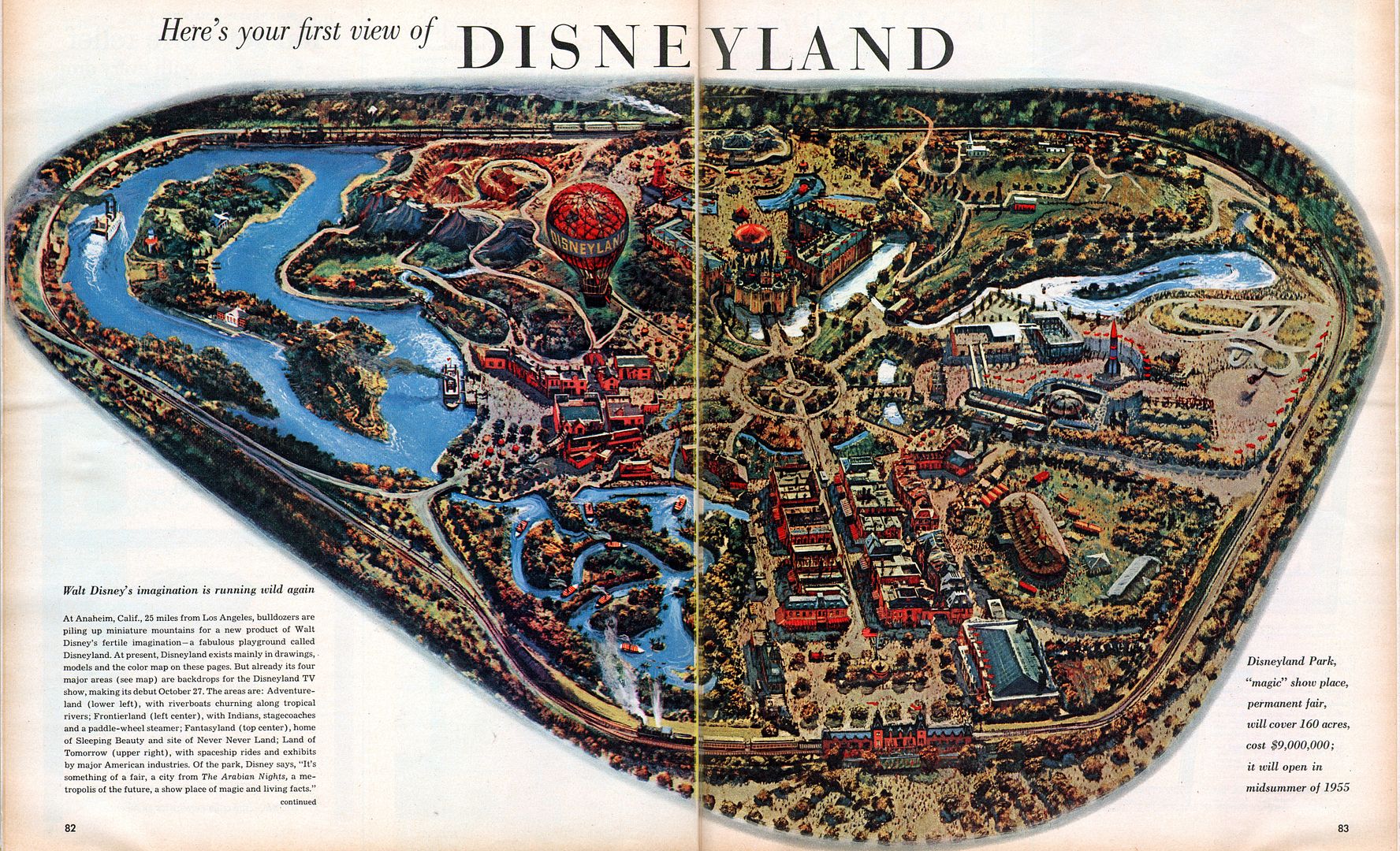 Just found on the web this scan of a 1954 American magazine double page "Here is your first view of Disneyland" with a great artwork of the park as envisioned at that time which is in fact Peter Ellenshaw famous painting of Disneyland. The scan is in high-res so click on the picture to get in in larger size!