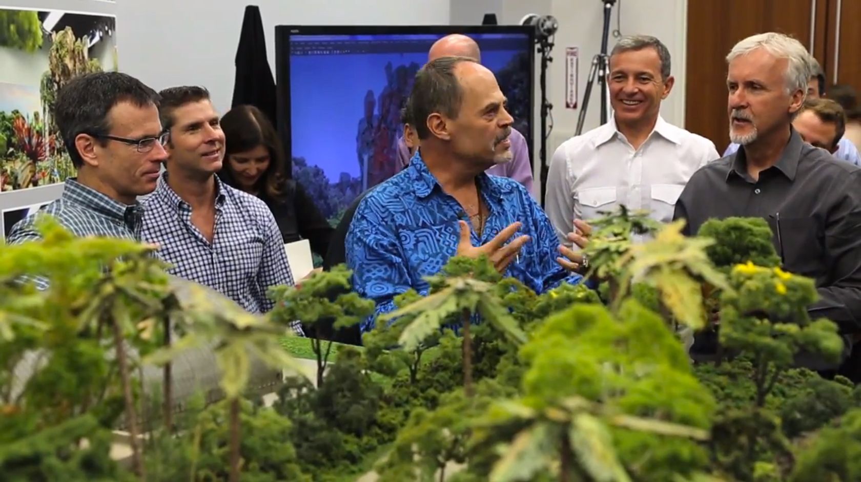 First, there is shots of a meeting at WDI with James Cameron, Bob Iger, Tom Staggs, Joe Rhode and others WDI Imagineers in a room with a model of Avatar land...