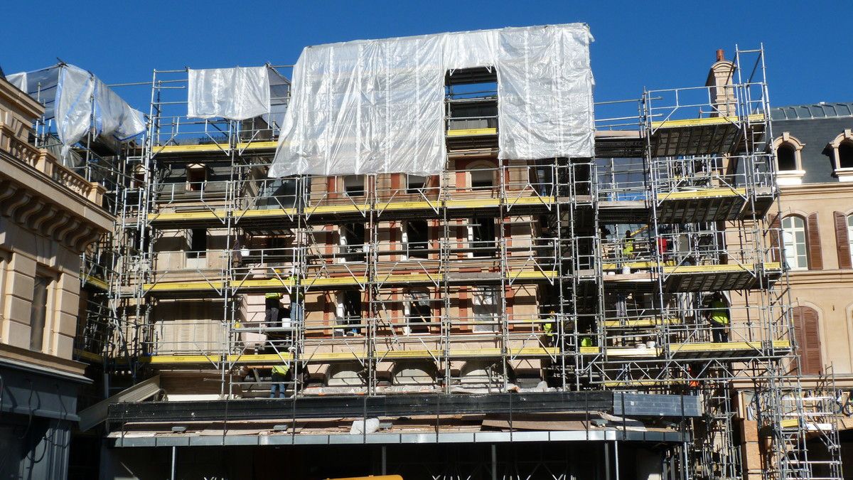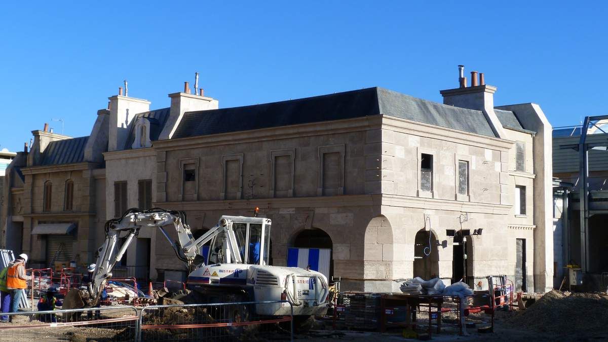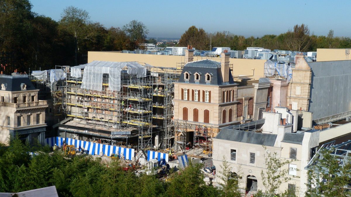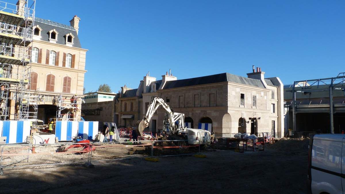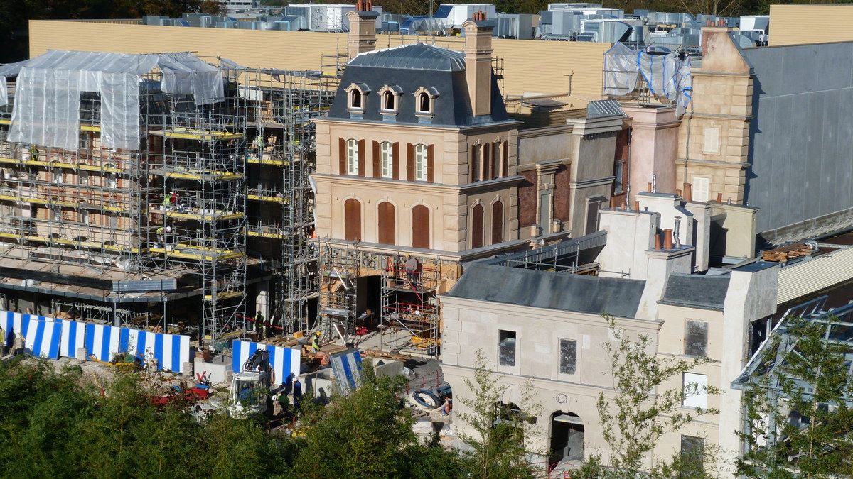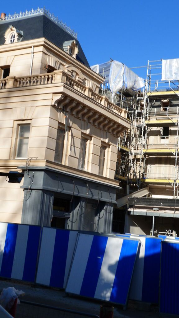 What is new this week, as you will see on the last pictures below, is that scaffoldings have been removed on the right wing buildings, the one at the right of the show building in which guests will find a merch shop and where a big part of the exterior queue will take place. You'll note too the difference of architecture with the buildings on the other side.