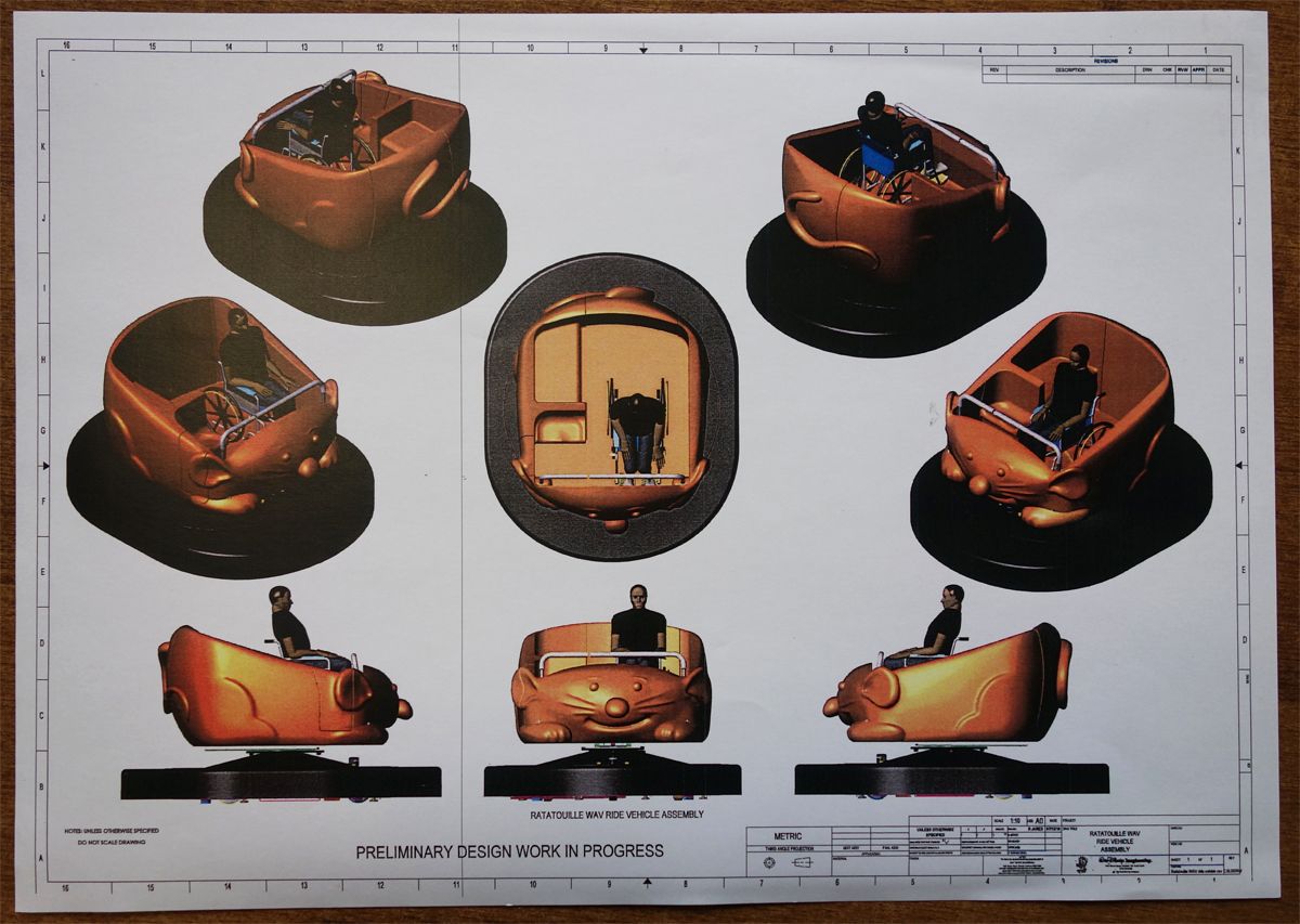I remind you that the ride - which has a final french title "L'aventure totalement toquée de Rémi" - will use a trackless vehicle system, with 3D projections on multiple screens all along the ride, that the ride vehicle will be themed like if it was a rat and all this with oversized decors to allow the guests to feel they've been reduced at the size of a rat! Above, the concept-art showing the ride vehicle design for disabled guests.
