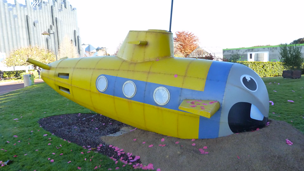 A Raving Rabbids submarine stands in the garden near the above show building entrance.