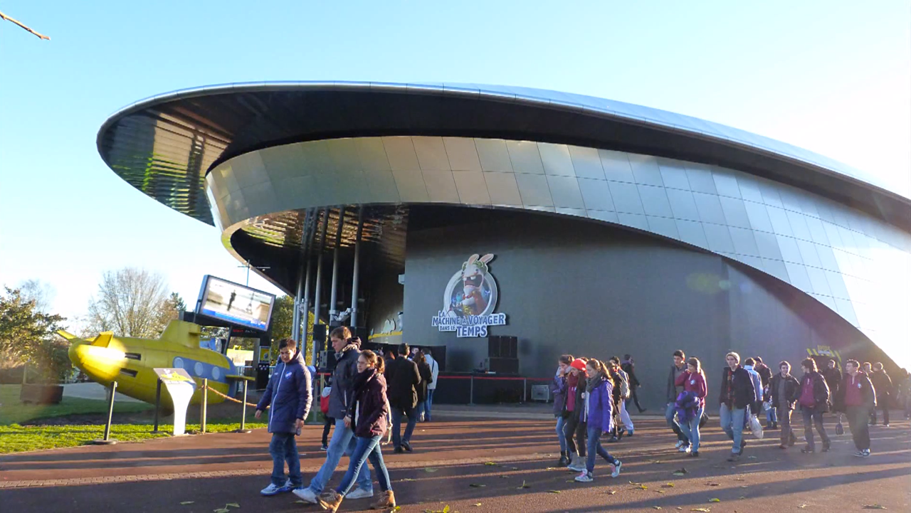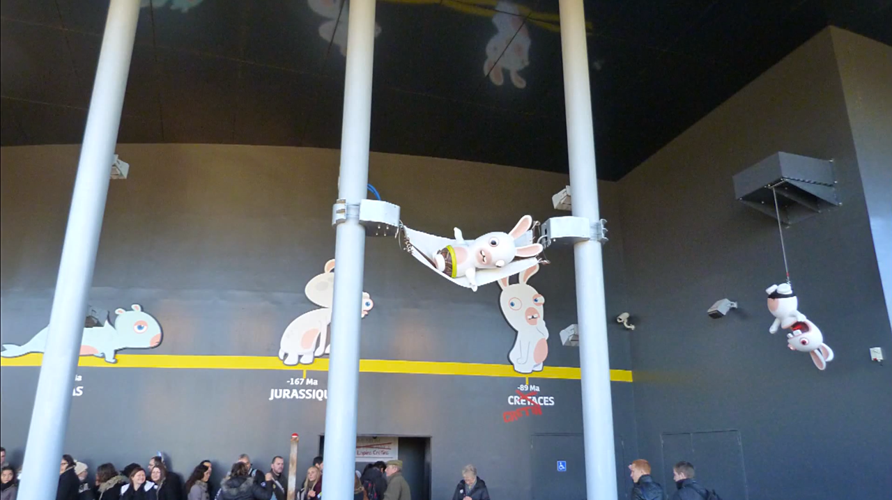 In “La Machine à Voyager dans le Temps” - Time Machine, in english - guests walk aboard a vehicle for a time travel with the Raving Rabbids, and they will be travelling from the Ice Age to Ancient Greece and up to the moon, thanks to the crazy rabbits’ laboratory. Jora Vision used for the ride a combination of 3-D projections, light effects, customized ride vehicles and the newest interactive dark ride techniques to create a unique attraction. The ride use is also located in the same building where the attraction "Les Animaux du Futur" was previously and according to Max is much more fun than the previous ride.