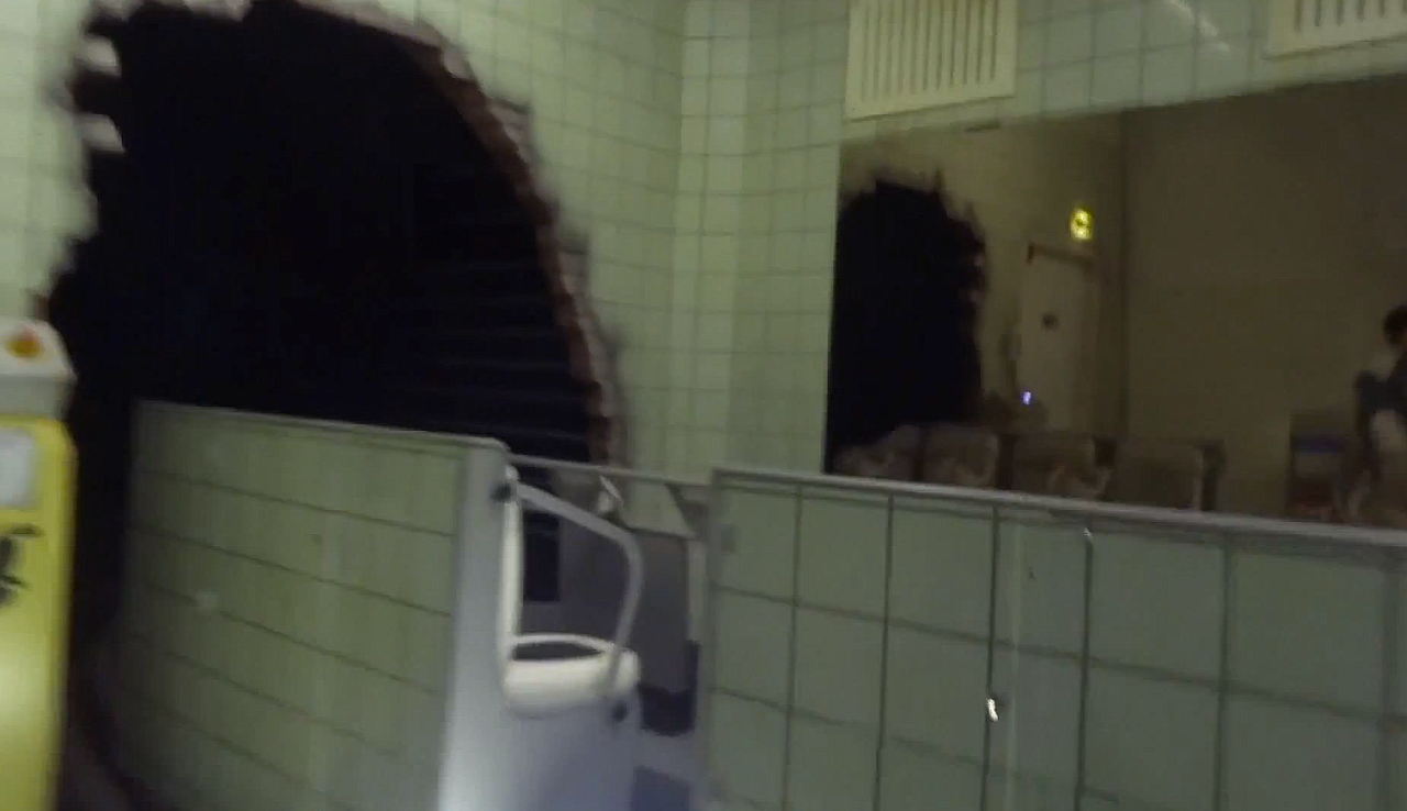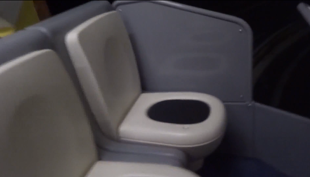 ...with a sign on the doors showing a Raving Rabbid sit on a toilet bowl and a restroom attendant on the TV screens above doors telling you that it's time to make a stop to the toilets before embarking...