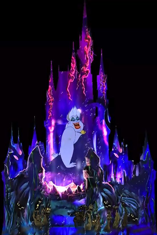 The Disney Parks blog has posted pictures showing the new Disney Villains sequence in the WDW Celebrate the Magic show on WDW Magic Kingdom castle. According to Disney Parks: "This new segment of “Celebrate the Magic” places the Disney villains center stage. From the sea witch Ursula, lording over the poor unfortunate souls trapped in her underwater lair, to the demon Chernabog from Walt Disney’s “Fantasia,” spreading his wings across the face of Cinderella Castle, it promises to be a particularly dark and foreboding chapter".