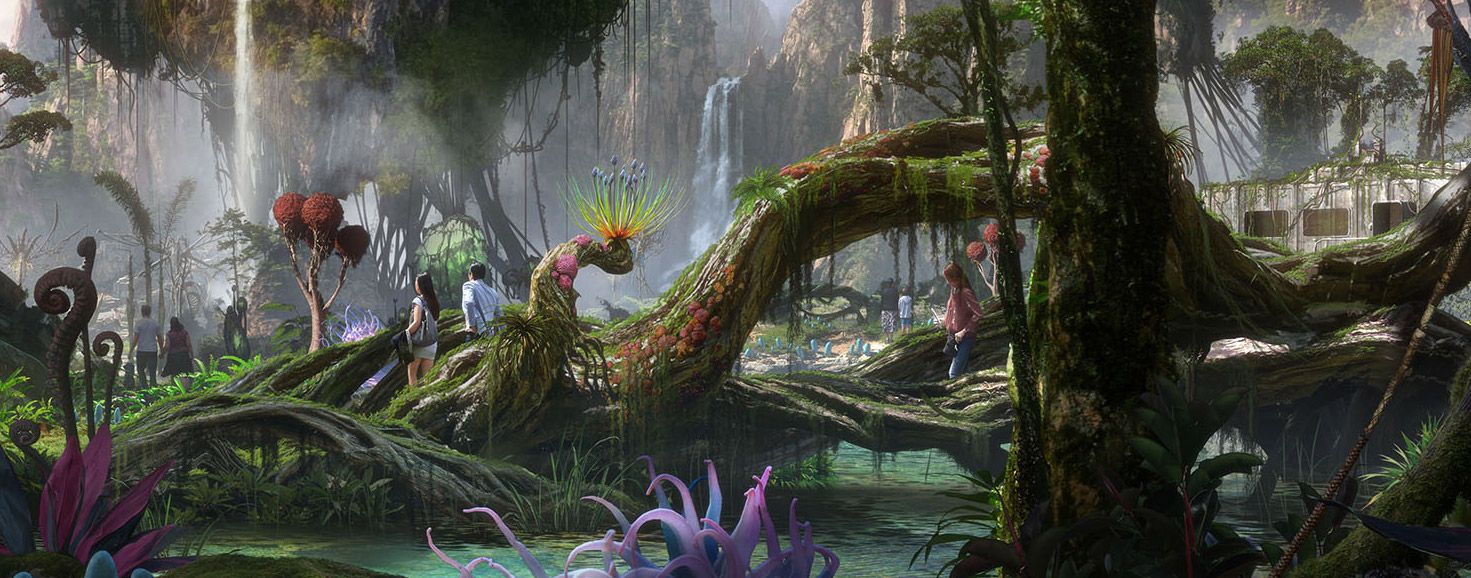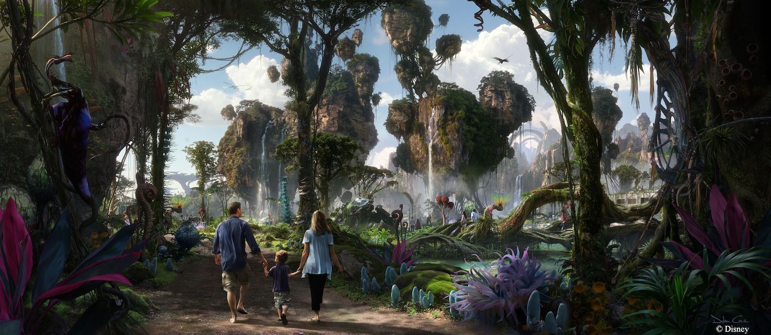 "As these concept renderings show in epic scale, in the world of AVATAR guests will encounter awe-inspiring floating mountains and wander through a nighttime jungle of bioluminescent plants that are alive with light and sound. Guests will also discover what it feels like to soar into the sky riding a Banshee".