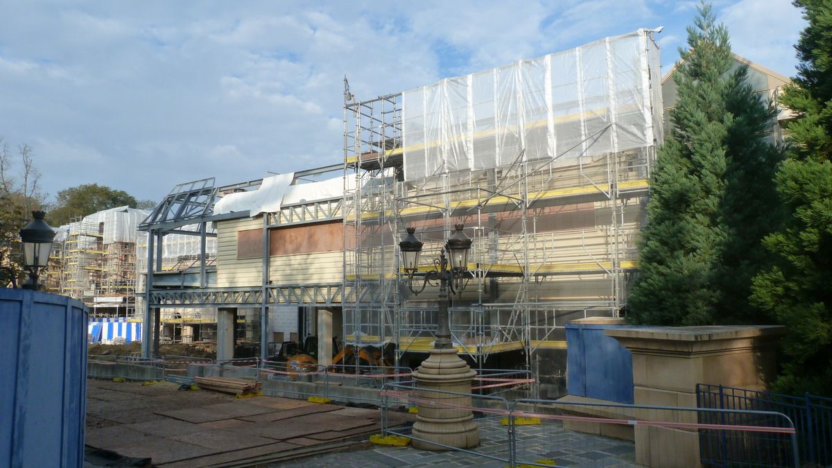 As you can see the facades are almost finished for the ones of the show building and the restaurant but not totally on the right side where guests will find a merchandise shop and the start of the queue line.