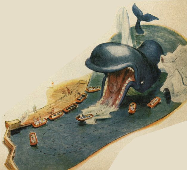 But the other artwork interesting on this double page is the flume ride with Monstro, the whale from Pinnochio. We've seen this artwork before and know that it is one showing "a ride that never was" but obviously the magazine, specially in 1955, got all these artworks from Disney which means that the ride was really envisioned to be built at that time and may be even shortly after Disneyland opening day. This Monstro sketch showing a straight flume was likely in reaction to the most popular ride at Coney Island that every operator told Walt he'd have to have "Chutes the Chutes". Finally the Monstro ride was never built but who knows, may be it will be one day?