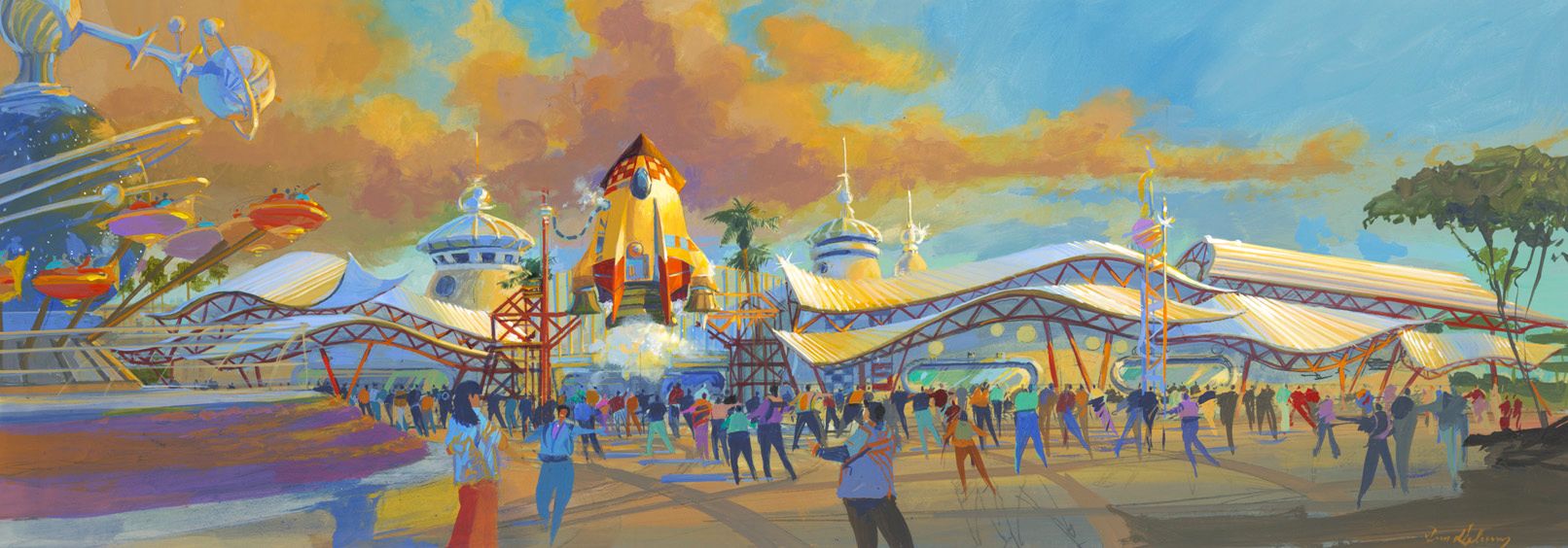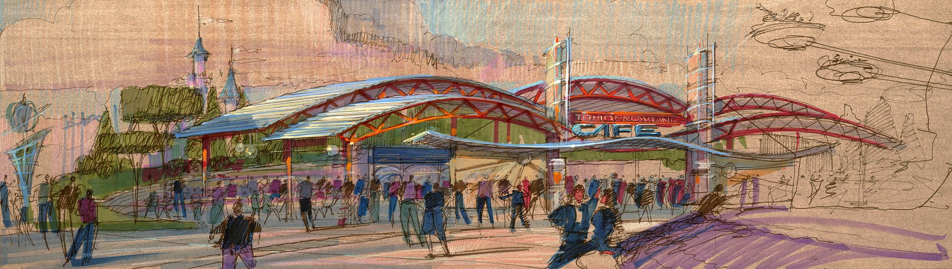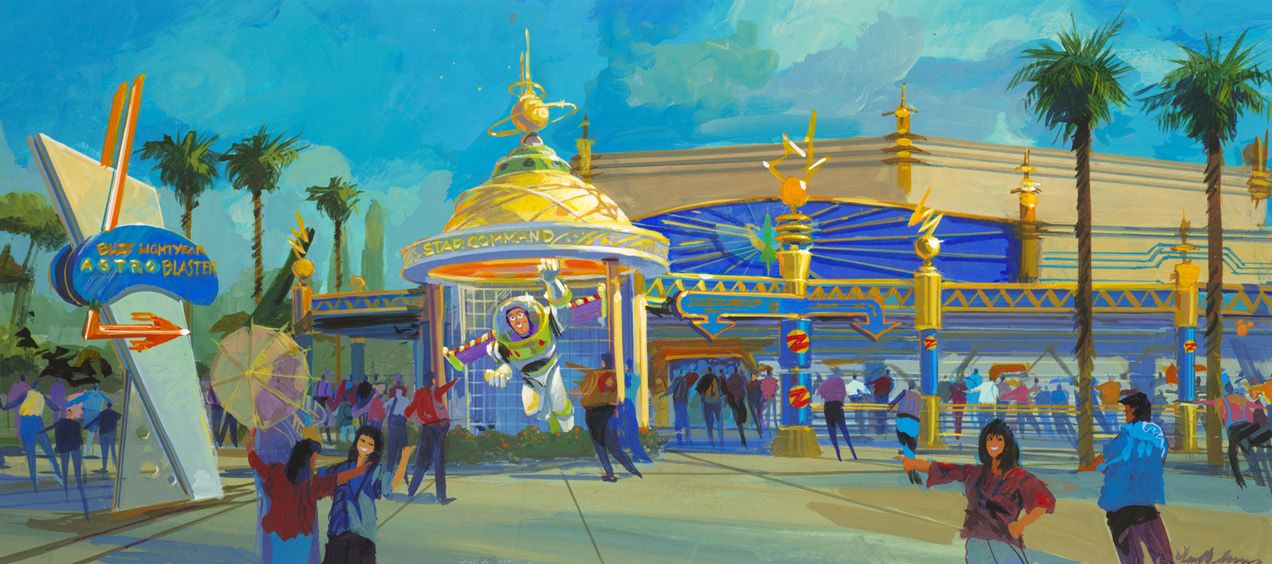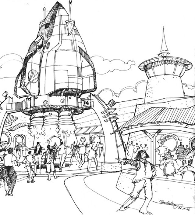 T.D : So we took the idea of a space port ,we have different style of architecture...it’s a kind of space encampment, a space port where you go when you journey to other planets. We have two very large restaurants, and the big restaurant called “Starliner Diner” have a rocket ship in the front and it’s a place where you go before you go in outer space: there is big posters of space travel inside, we have rockets, etc...this is a place where you go to have lunch and food before you go up to your journey into Space Mountain and Buzz Lightyear... It’s also one of the largest restaurant we ever built in a Tomorrowland with an incredible design