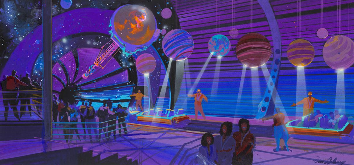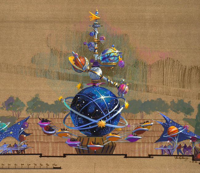 A.L: Talking about flying saucers, it reminds me the Eddie Sotto project for Tokyo Disneyland’s Tomorrowland. It was supposed to be called ”Sci-fi City” , and one of the attraction was supposed to be small flying saucers flying around a huge flying saucer.