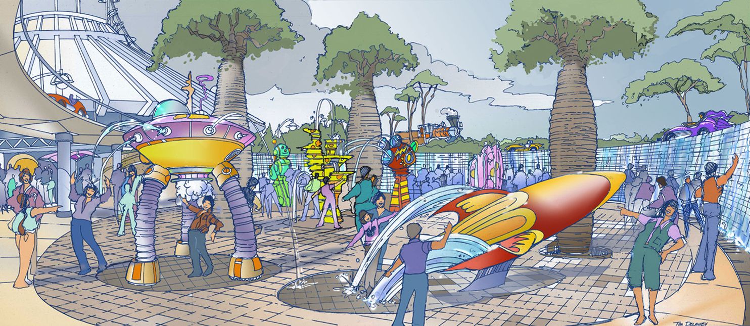 T.D: Throughout the land we’re using these motifs of these planets and an alien landscape to make you feel that you are in another world...You have to see the style of the buildings to see how it looks like. It’s not mean to look like in the fifties, like disneyland was in 1955, it has much more of an organic field to it. We are also using a lot of colours in the land, and the reason for that is that most of the time Hong Kong have grey skies and humid, so we wanted these colours to bring a kind of more of a familiar quality to our Tomorrowland. Secondly, about landscaping, we have a lot of landscaping in covered areas, so we create a sense of the future and tomorrow with more human kind of space.