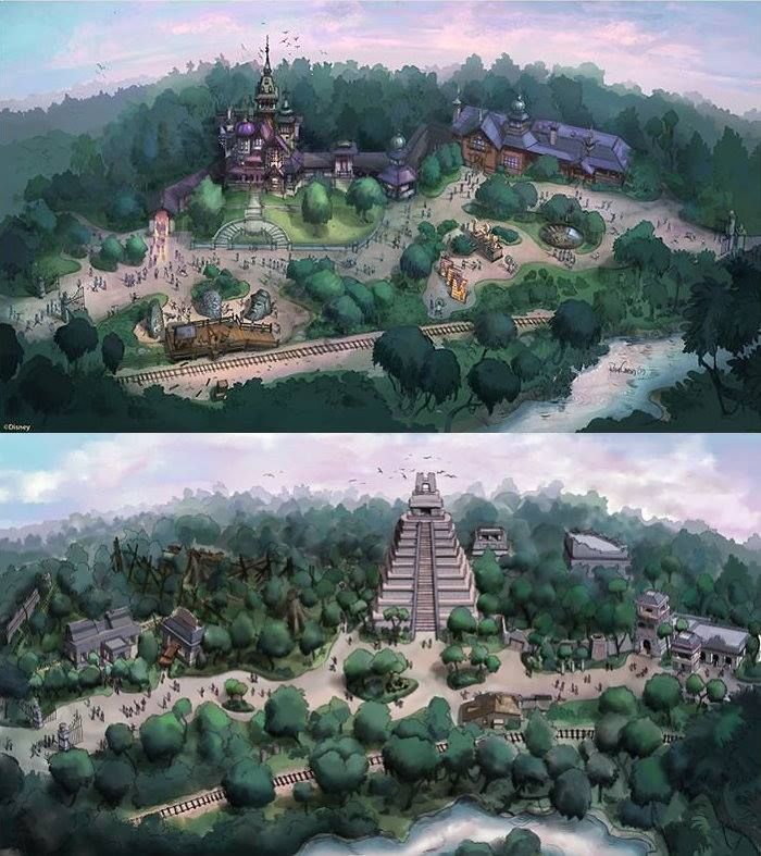 Talking about HKDL here is a great piece of artwork done by S.W Wilson, the same person who did the great map of DL including Star Wars Land that you can see on the next post below. On the top you have the WDI artwork for Mystic Manor and on the bottom, done in the same style he envisioned an Indiana Jones Adventure Pyramid ( like at TDS ) and an Indy mini land. Good idea, they should built it in the remaining land at HKDL Adventureland ( as well as at DLP! ). The full triptych artwork can be seen on his web site HERE.