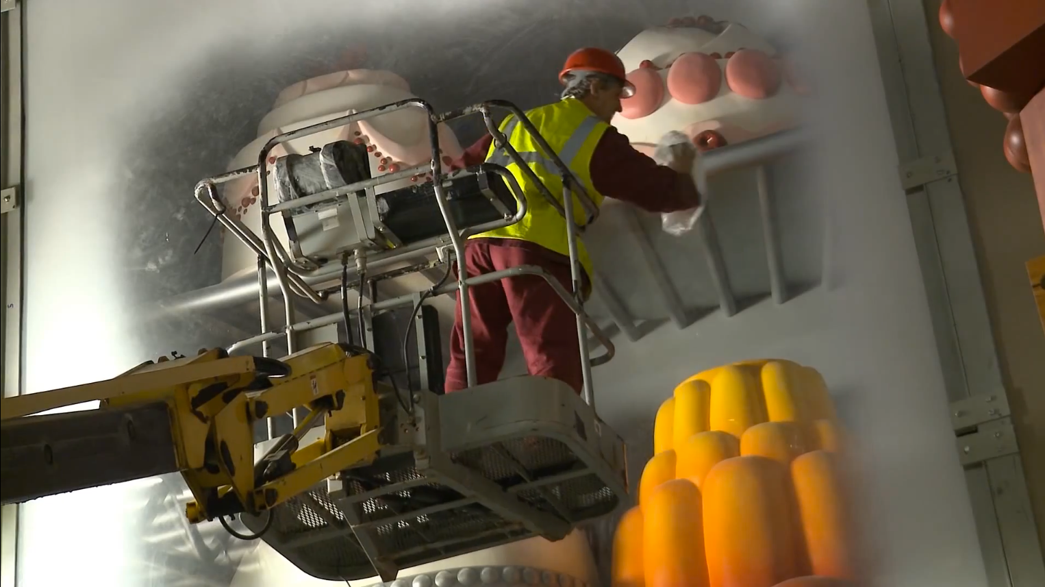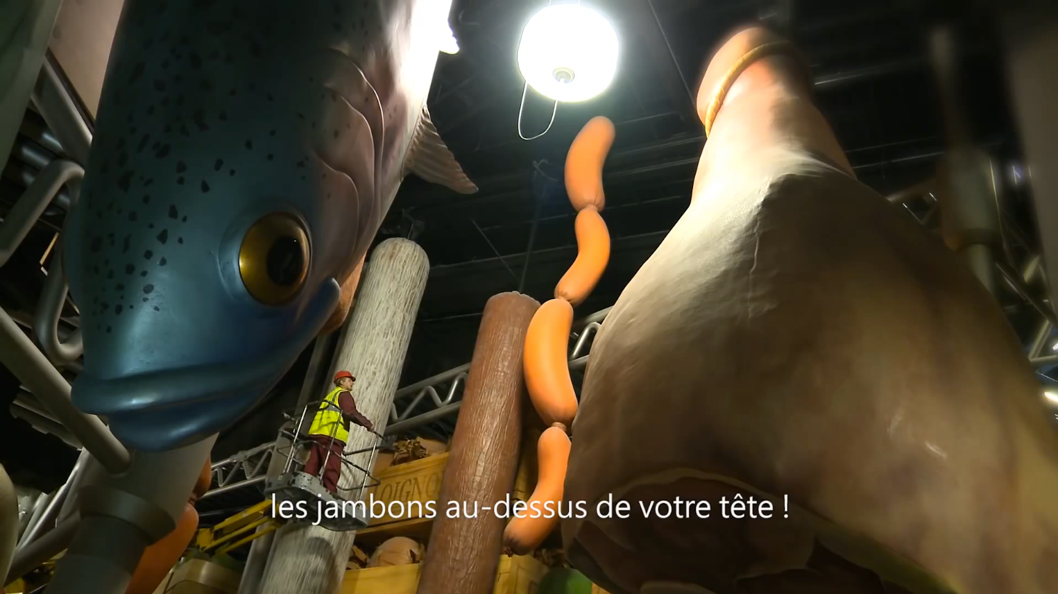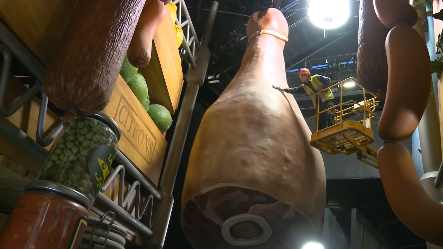 The video then shows decors of giant food which most probably are part of the scene inside the restaurant storeroom...