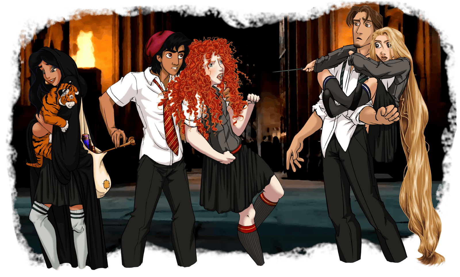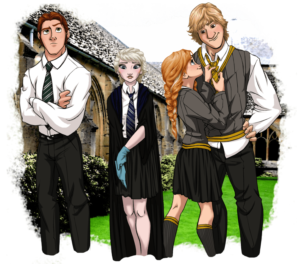Something fun for this Sunday. Artist Annabella, aka Eira1893 did these artworks of Disney characters attending Harry Potter Hogwarts Wizards school. Above, Prince Hans, Queen Elsa, Princess Anna, and Kristoff Bjorgman from Frozen and below Princess Aurora and Prince Phillip.