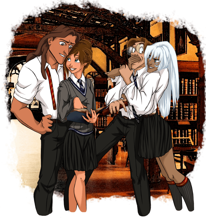 Below, Tarzan, Jane Porter, Milo Thatch, and Princess Kida.