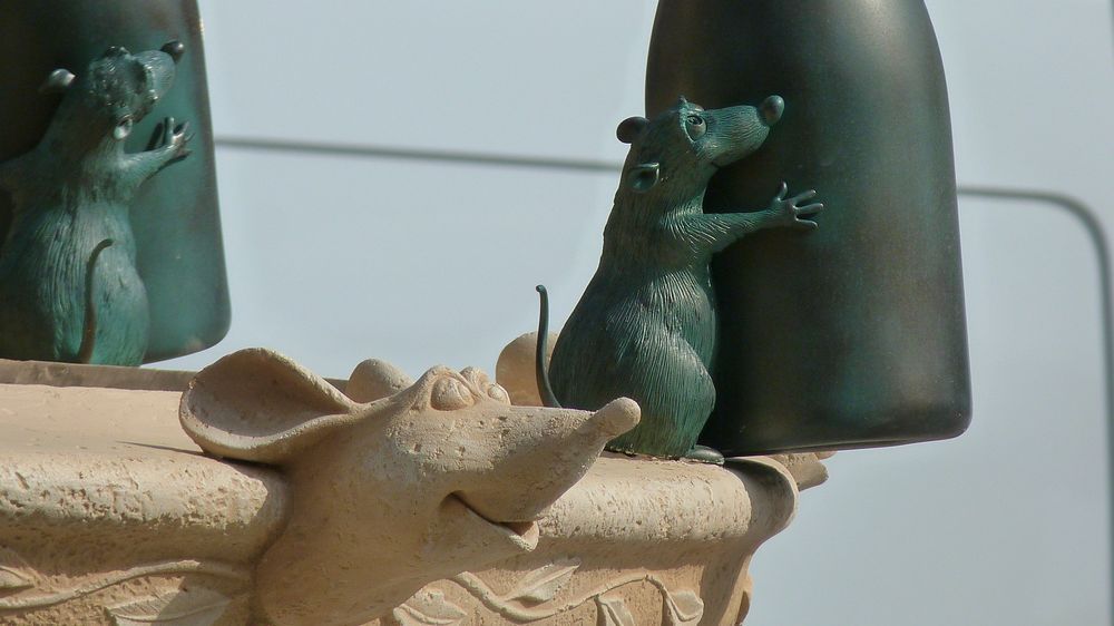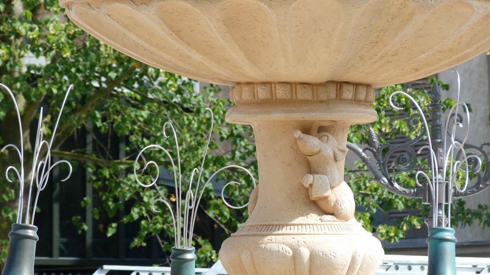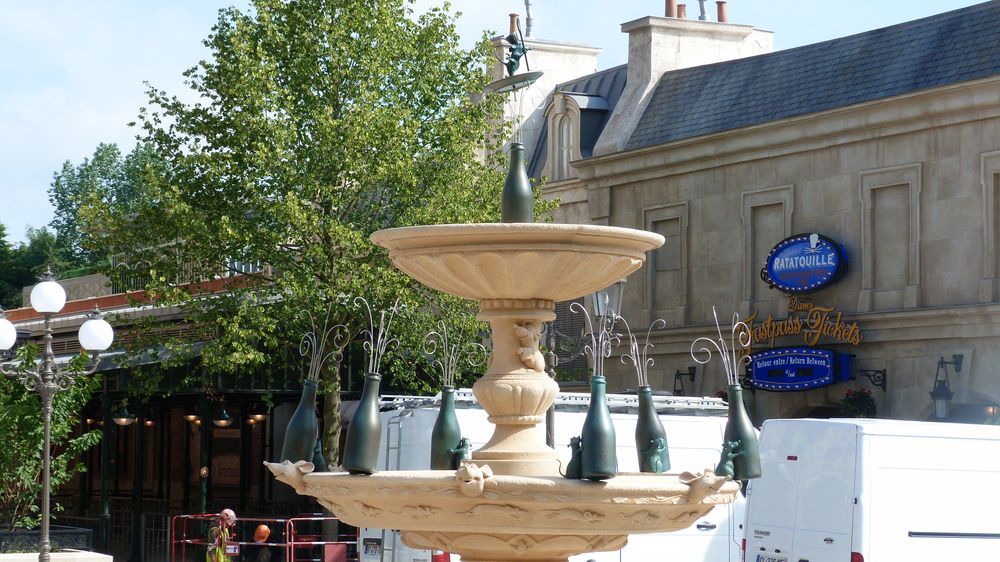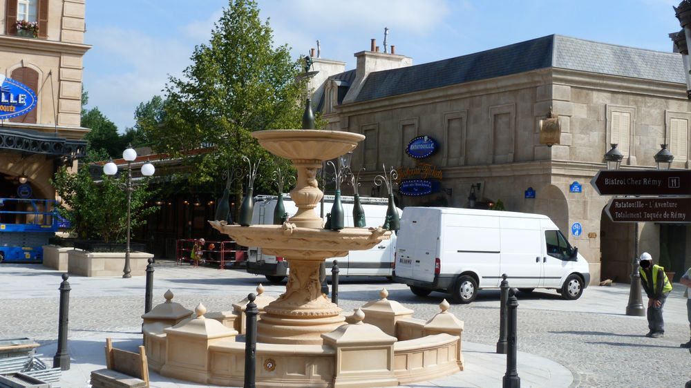Everything is clean and ready for the press event but the big news today is the Remy fountain in the center of the plaza which is now finished and ready for opening. And we're not just talking about the scaffolding removal, but of the addition of champagne bottles held by rats and also the contrast enhancement on the stone to highlight the reliefs.