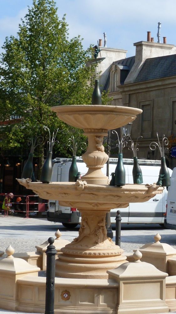 Everything is clean and ready for the press event but the big news today is the Remy fountain in the center of the plaza which is now finished and ready for opening. And we're not just talking about the scaffolding removal, but of the addition of champagne bottles held by rats and also the contrast enhancement on the stone to highlight the reliefs.