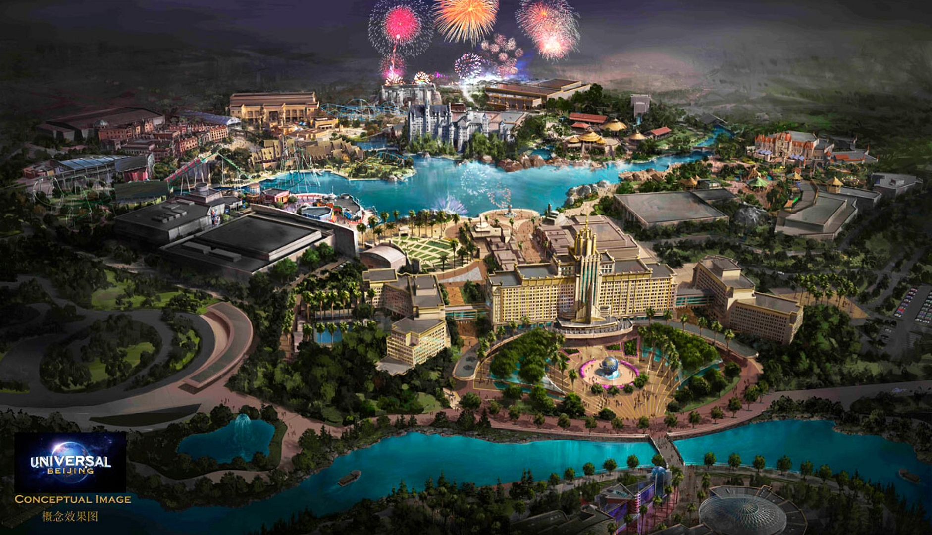 What I find interesting about this concept art is that they tried to imitate Disney's Shanghai park with its water in the front, a big open entrance after the gates and then they added fireworks in the background as if Beijing needs fireworks shooting off daily creating more pollution