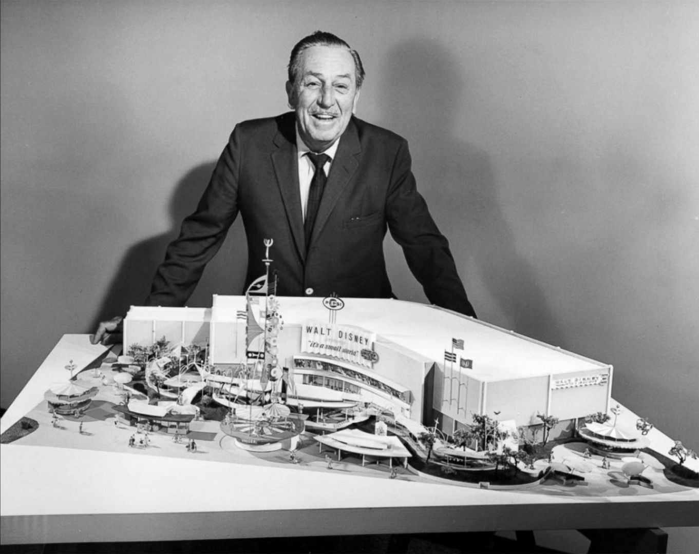Walt in front of the 1963 World Fair It's a Small World pavilion model.