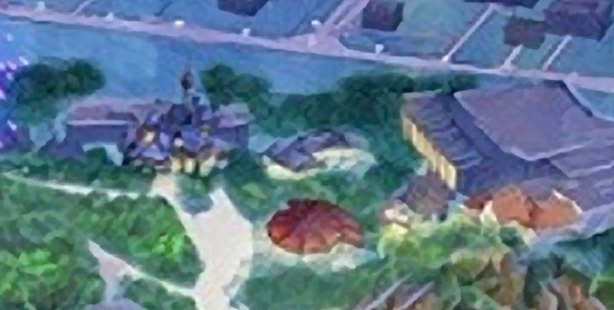 Let me show you why. Below, the part of the SDL bird eye view supposedly showing Mystic Manor, in dark blue color on the left, with on the right what we think will be the Winnie the Pooh ride and Hunny Pot Spin, in dark red.