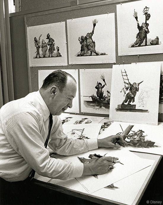 Great picture of Marc Davis creating the artwork for Pirates of Caribbean characters in the 1960's, coming from a Disney Parks article about Marc and Alice Main Street window that you can read HERE.