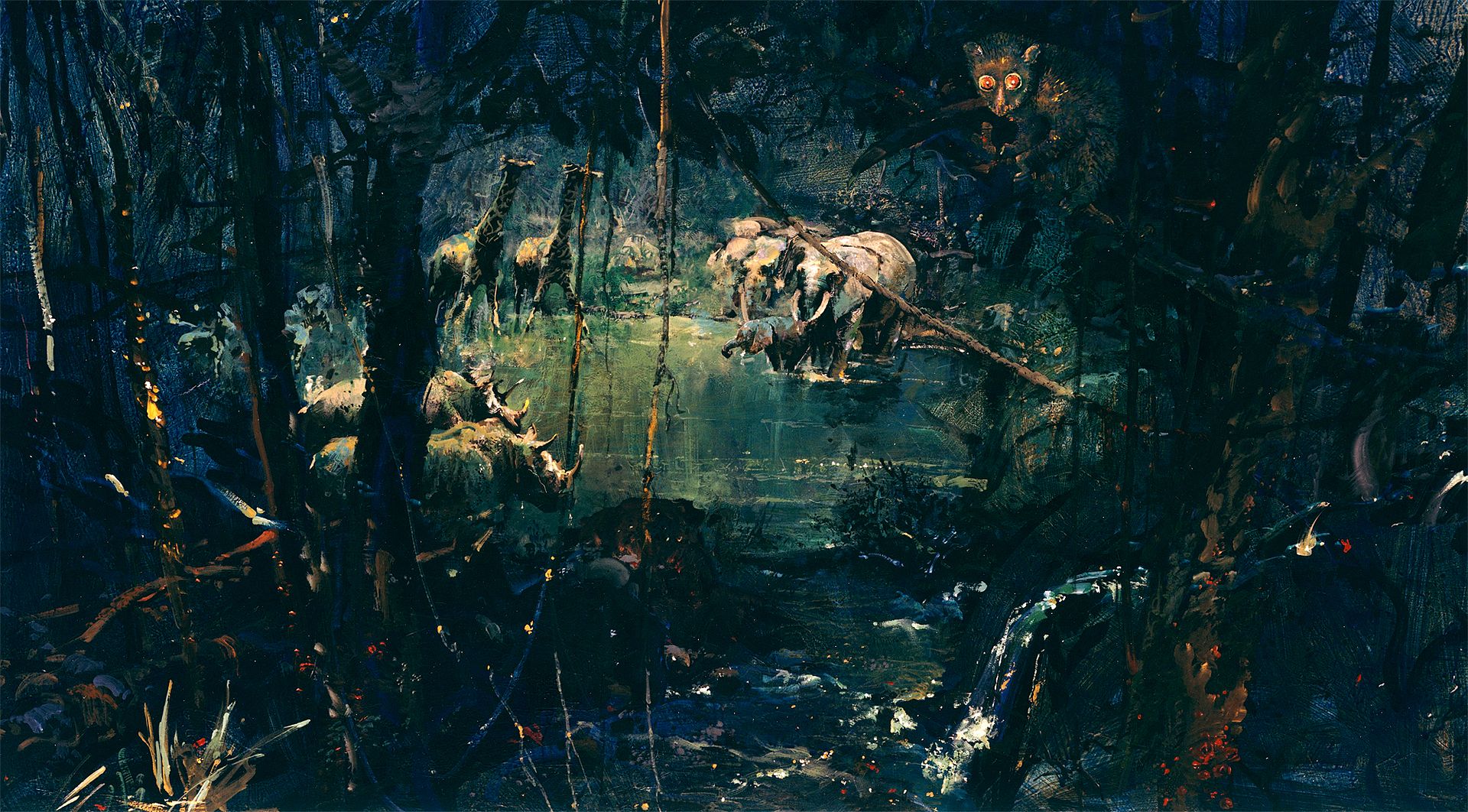 Then, we are again following our old friend, the griot, through the forests of Kenya. what is that rumbling sound coming from the green wall ahead? We approach cautiously. a soft hissing sound, as of air being blown through a large hose, comes from behind the leafy screen - the muffled crack of a limb being broken, then a glint of mottled cream and white - ivory - and out of the leaves an enormous shadow materializes. Suddenly the forest parts and a huge elephant towers