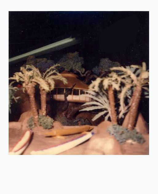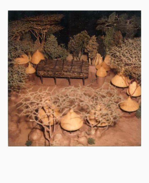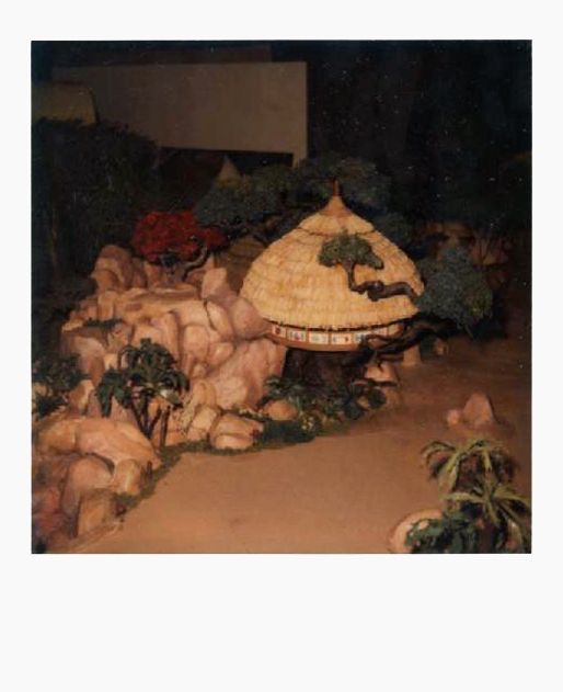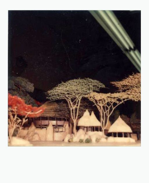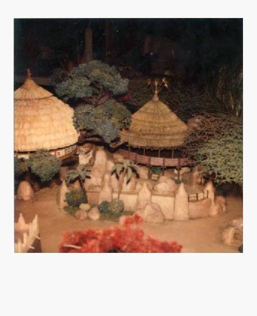 "As the guests enter the salon to await the film show they are greeted by the sound of a full orchestral arrangement of traditional african instruments and voices in the "welcome ceremony." The waiting area will be the interior of a chief's house attractively decorated with colorful african masks and objects individually illuminated. Centrally located will be the circular preshow stage mounted on a dogon platform called a togu—na. Traditional african musical instruments - xylophone, the stringed cora, the mbira (or stomach piano), fifes, horns, flutes, bells and gourd rattles—-will be hung from the ceiling. After the opening "welcome" number there will be other arrangements featuring these instruments playing african theme music. Many african tribes have musical themes to represent nature's manifestations——the forest, rivers, mountains, rain, different bird and animal species, etc, these will be the themes we will use. Each will be identified as will the names of the various instruments. this section of the preshow in the waiting salon will last approximately nine minutes -slightly over one half of the total 17 minute time for the pre show."