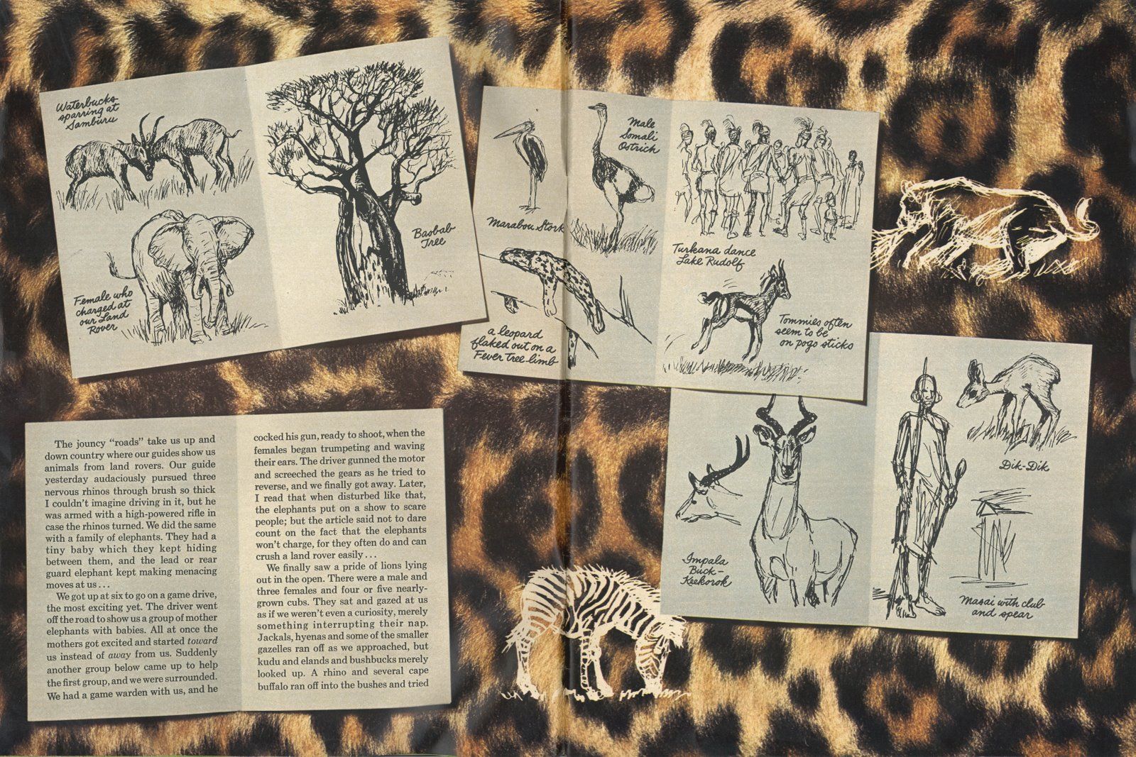 Wild animals it pursues. we race out onto the plain and our purpose immediately becomes clear. We are aboard a game—catching vehicle, manned by the Kenya government capture and translocation unit, and the ride is the most hair—raising experience imaginable. flat—out on the tail of a herd of giraffe, we follow whereever they go, through gulleys, over ant hills, across rough grasslands. We plow through thickets of thorn bush without slackening speed, explosions of wicked thorns rat-tat-tatting against the windshield. We pull alongside a young giraffe and a man who seems to cling to the truck with his toes reaches out with a lasso on a pole and nooses the animal.