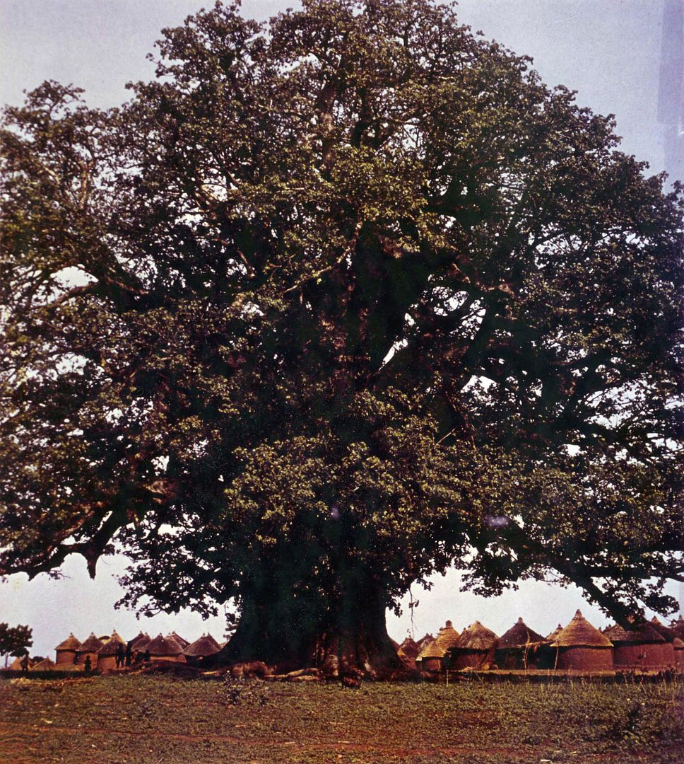 The camera moves toward the source of sound - behind the giant buttresses of a forest tree. out of the shadows of the roots, a figure steps into the sunlight - an old man, the griot an appealing-looking gentleman with wrinkled skin and a sparkle of humor in his eyes. This engaging personality who will become the leitmotiv of our film has a face and bearing warm with personality. On a strap held tightly under his left armpit, he carries an hour—glass shaped squeezedrum - the ancient talking drum of west africa. The griot indicates to us, the camera, that we should follow him: the old man has become our symbolic guide. When he addresses us, it is directly into the camera: like us, he is an insider, and he engagingly (and somewhat conspiratorially) takes us along under his wing.