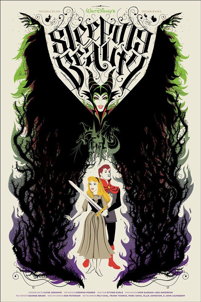 The artworks were done by artists Tom Whalen, Dave Perillo, Ken Taylor, Billy Baumann, Jay Shaw, David Petersen, Killian Eng, Kevin Tong, Jeff Soto, and many more, and inspired by Disney or Pixar animated films such as The Incredibles, Sleeping Beauty, Fantasia, Aladdin, 101 Dalmatians, The Rescuers, Alice in Wonderland, Wall-E, Up, and also by Disney movies like The Black Hole or The Cat from outer Space.