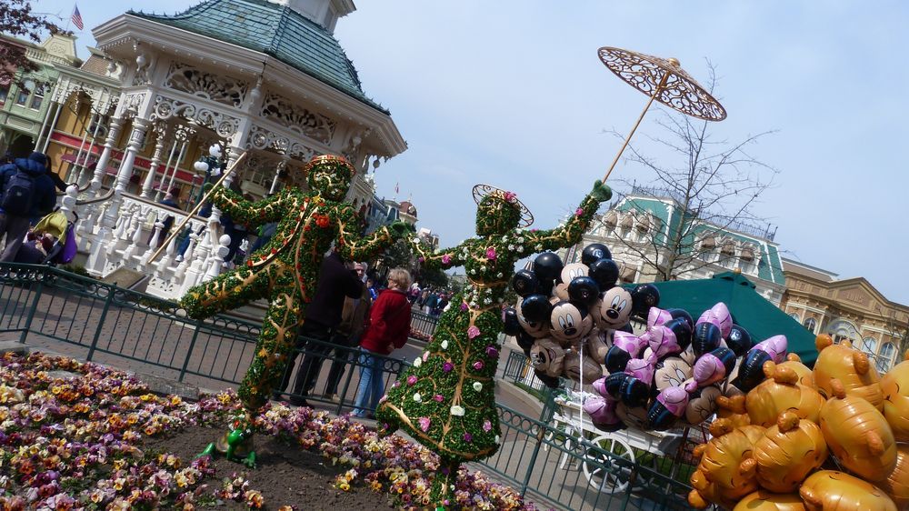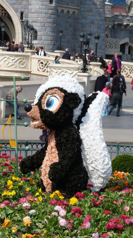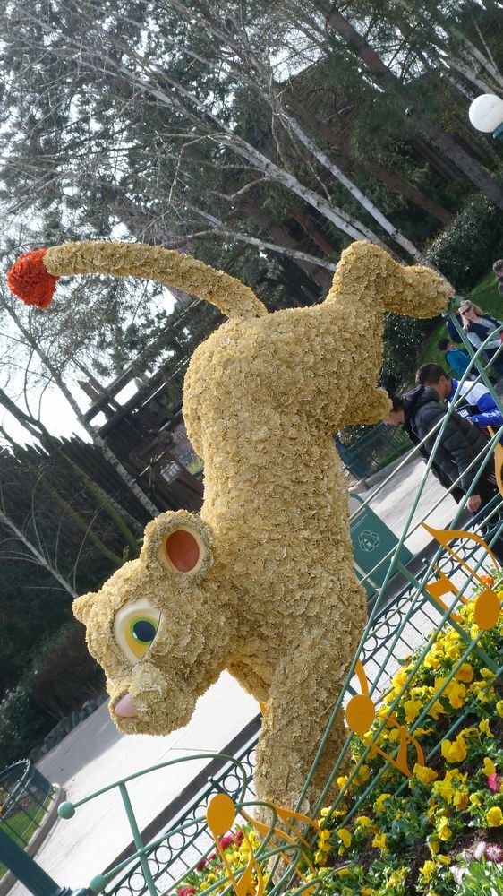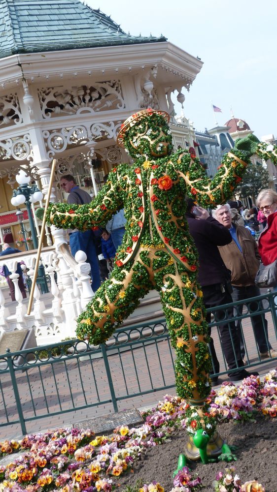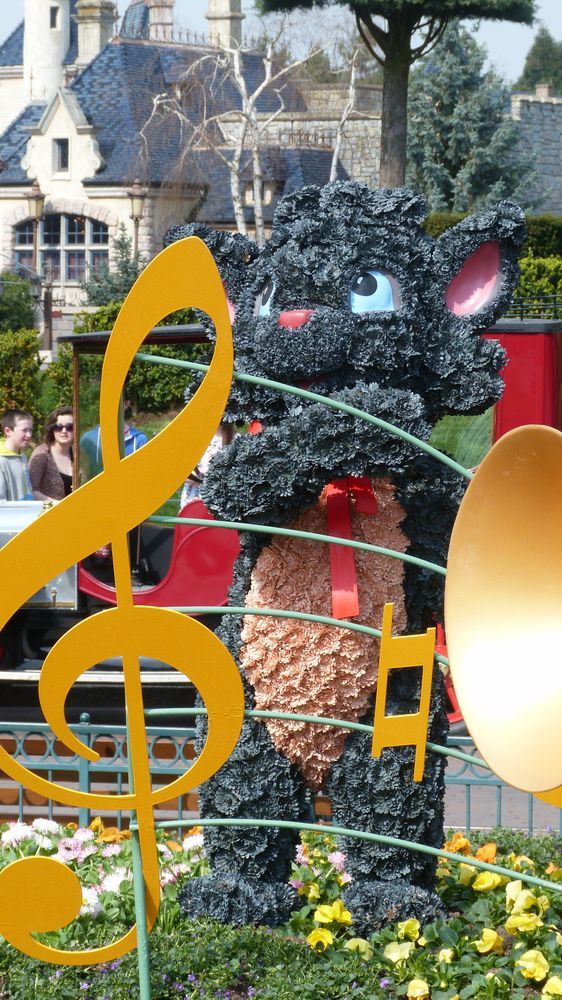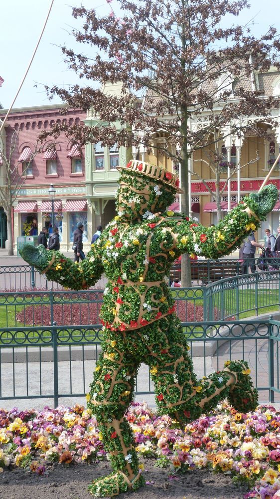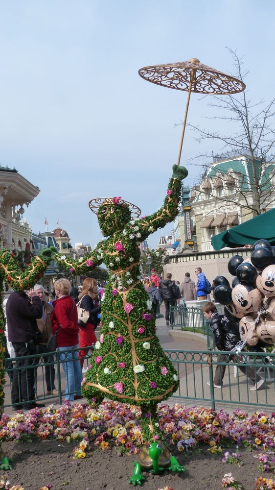 Topiaries are done with a mix of artificial and dry flowers for the simple reason that Paris climate and the three months of festivities make it impossible to use real flowers for the whole season. But don't worry flowerbeds are composed with real flowers. At the end, no less than 100,000 artificial flowers have been required to develop this Swing into Spring season ( not counting the 100,000 natural flowers ). Olivier Dussautoir has insisted that the musical notes in the decor are actual sheets of music and many Hiddens Mickey are hiding in the decorations.