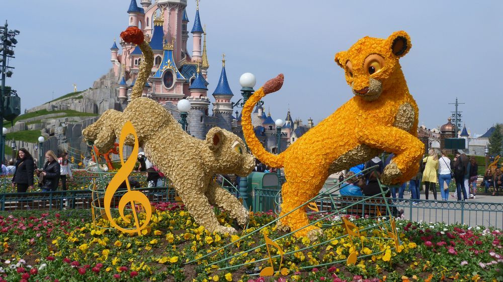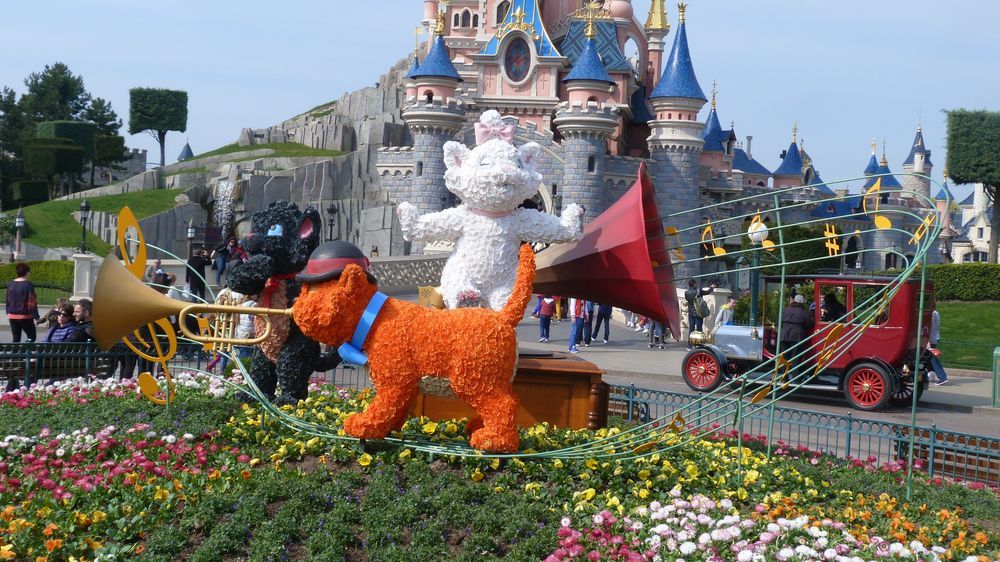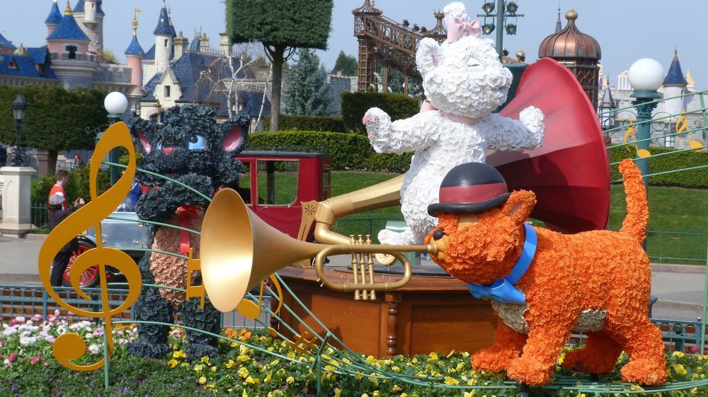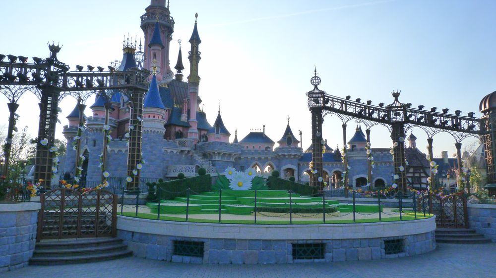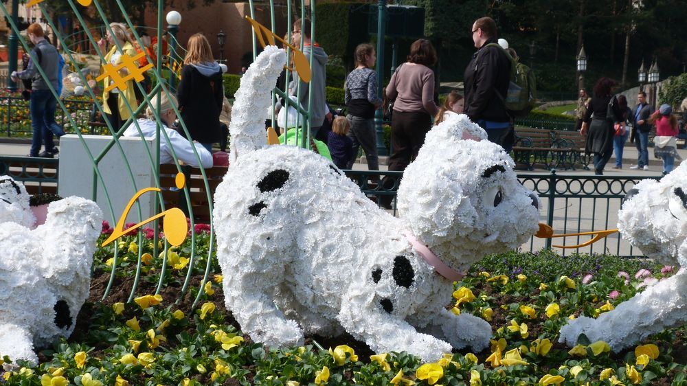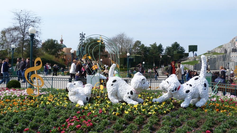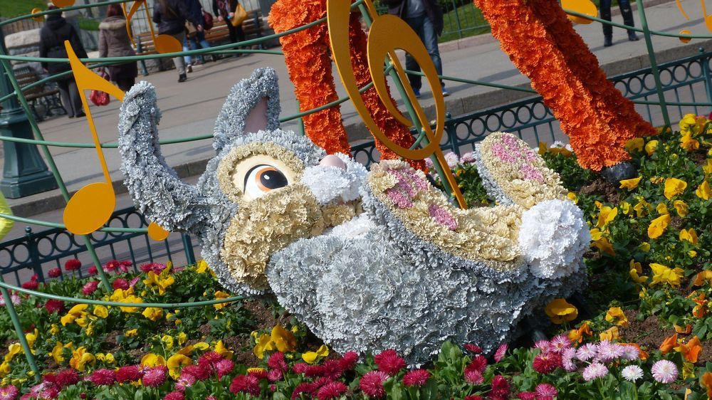 Topiaries are done with a mix of artificial and dry flowers for the simple reason that Paris climate and the three months of festivities make it impossible to use real flowers for the whole season. But don't worry flowerbeds are composed with real flowers. At the end, no less than 100,000 artificial flowers have been required to develop this Swing into Spring season ( not counting the 100,000 natural flowers ). Olivier Dussautoir has insisted that the musical notes in the decor are actual sheets of music and many Hiddens Mickey are hiding in the decorations.