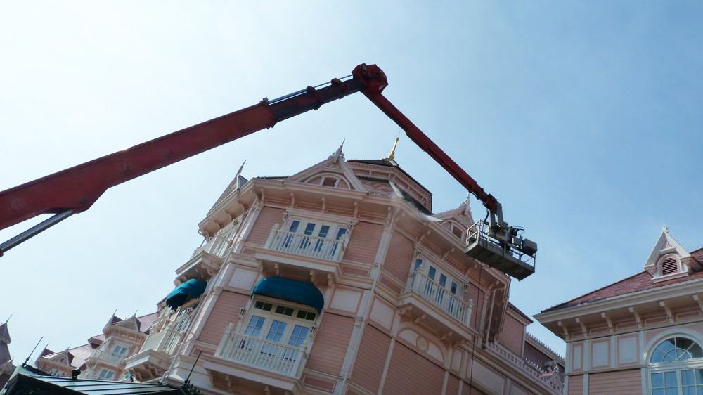 But first, let's stop at the Disneyland hotel with its facade currently being cleaned with high-pressure water so everything will look nice for the season opening.