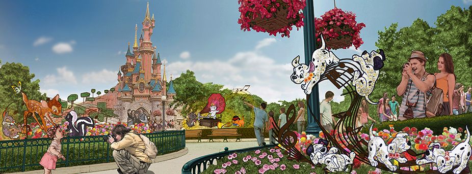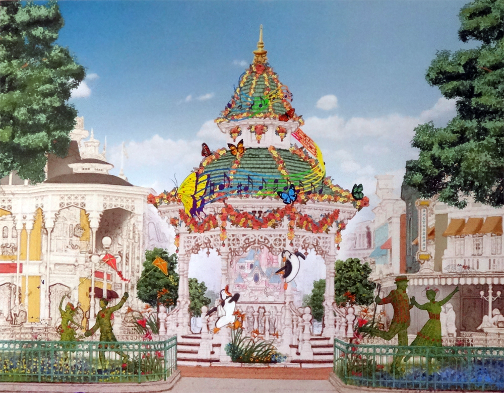 The future meeting point of Rapunzel will replace the one with Winnie the Pooh and will be adorned with a huge heart 3 meters high and 4.5 meters wide, made with boxwood and 10,000 artificial flowers. The 20th anniversary train was also completely redesigned as well as 3 cars of the Disney's Star 'n' Cars parade for the awaited performance of "Disney's Spring Promenade" which include 90 performers ( 30 dancers inspired by the character of Mary Poppins 30 dancers inspired by the character of Bert, 30 "sweeps" performers ), and add to that thirty Disney characters and fifteen musicians. At the end guests will have a show with 125 performers ( so more than in a parade) happening 5 times a day from 11:40 a.m. to 3:40 p.m. during 12.30 minutes ( see the park program for accurate hours ) from the Castle Stage to Central Plaza. The show is of course inspired by the theme of Spring and Mary Poppins movie which just celebrated its 50th anniversary. The final of the show will take place on the song "Let's go fly a kite".