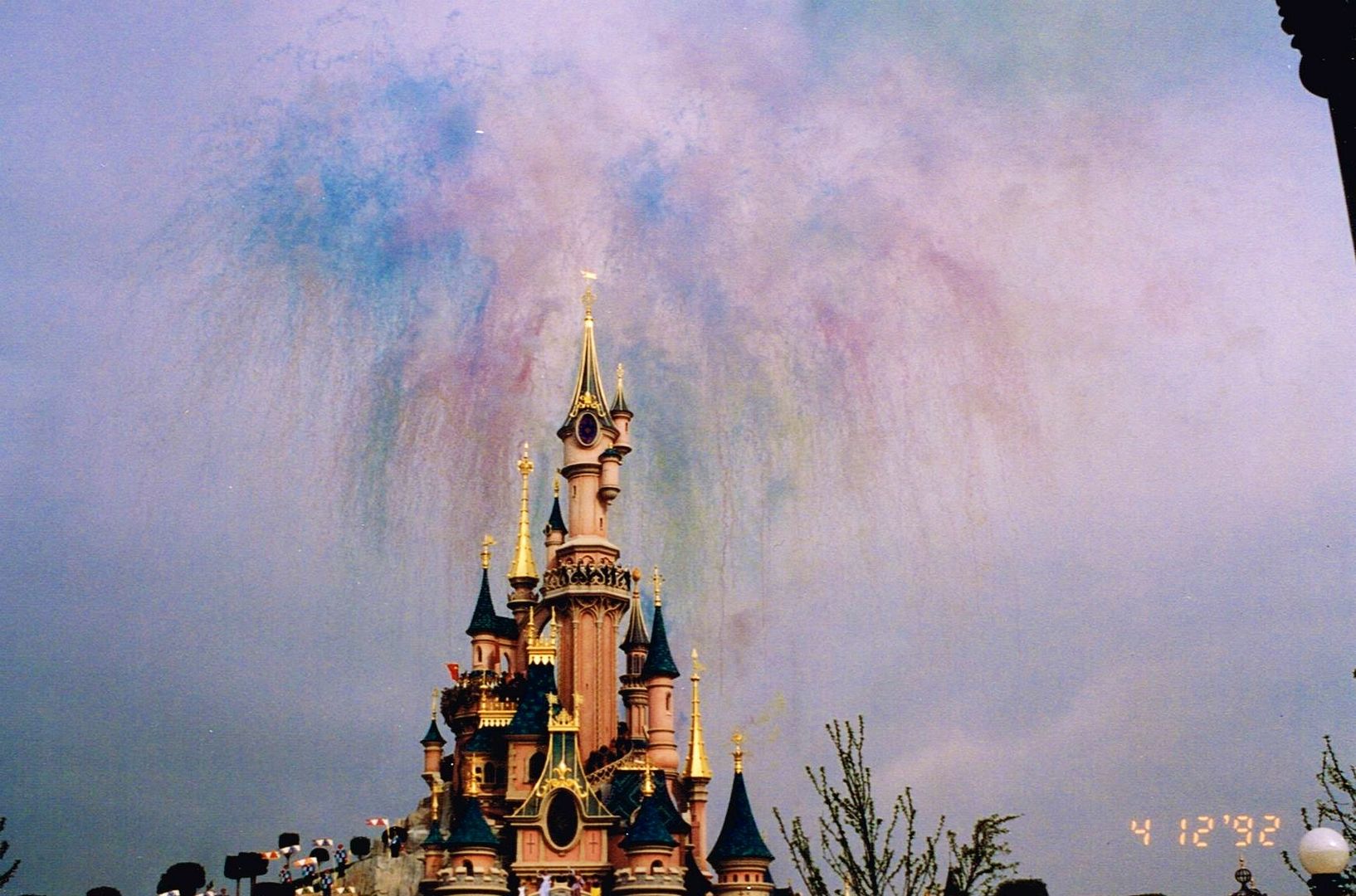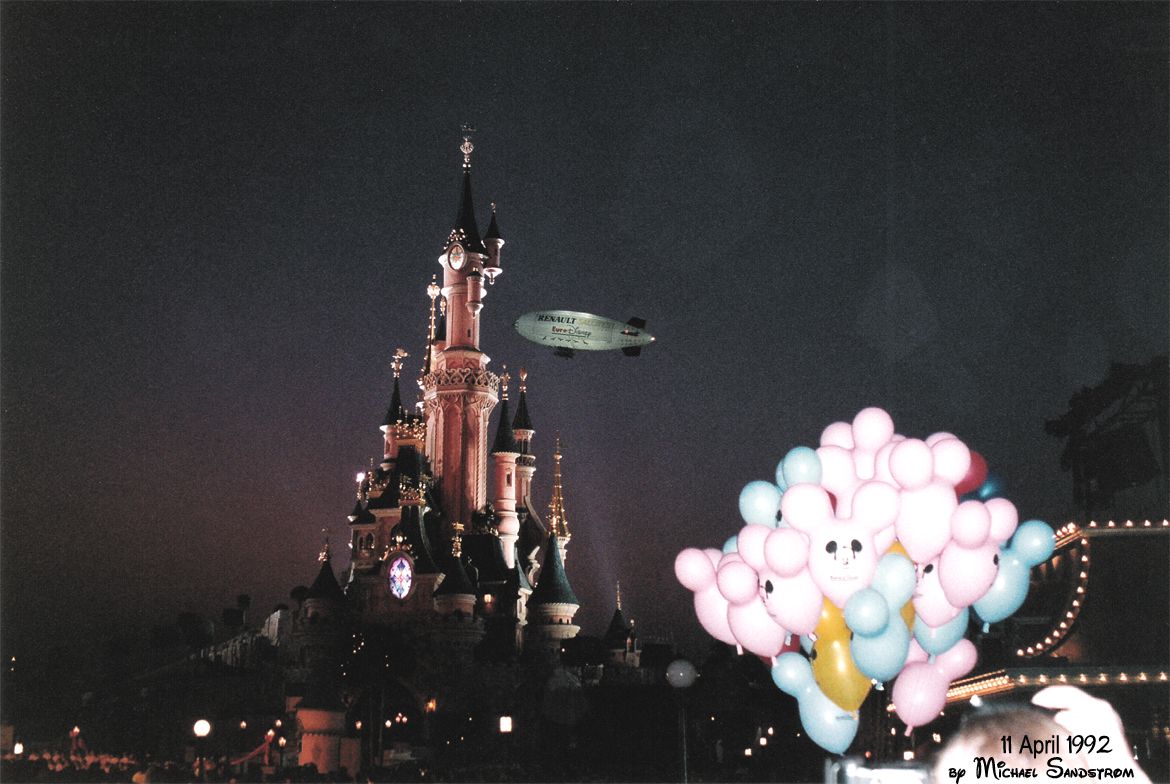 It was finally April 12, 1992, the official Opening Day of EuroDisneyland, and definitely a memorable day. The press was allowed into the park early on opening day, so i tool a taxi from Paris at dawn and made my way down Main Street very early. The weather was still lovely in the morning for the celebration events but then got quite cloudy, and raining by early evening. Fortunately, by then, i was staying right at the front gate in the Disneyland Paris Hotel, on its first night.