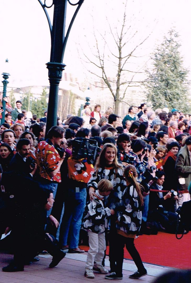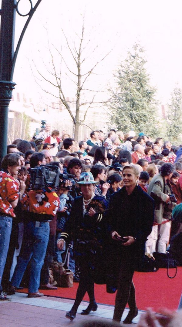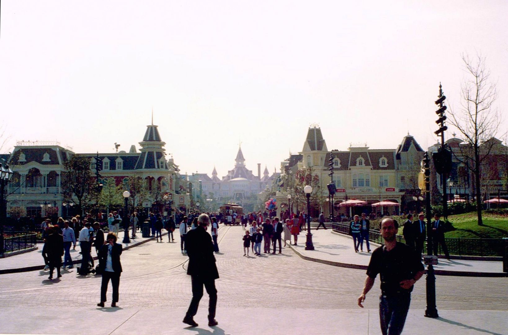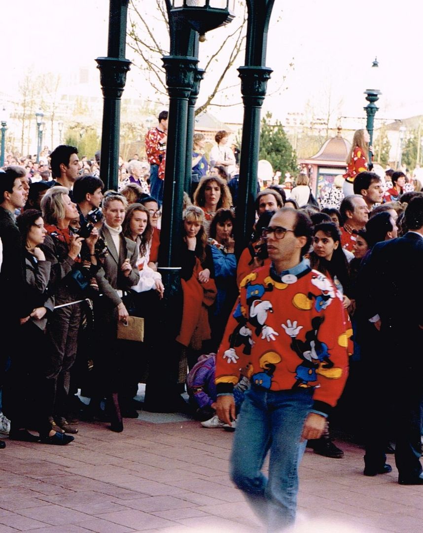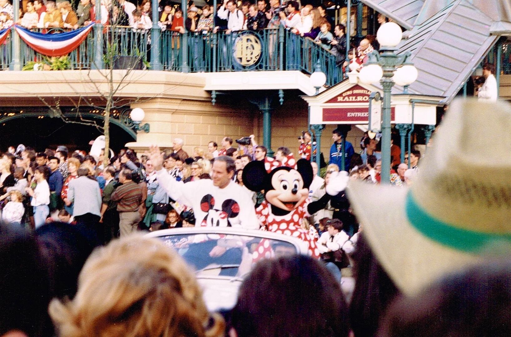 Michael Eisner rides down Main Street towards the hub, with Mickey and the first official family on the morning of 12 April 1992, and the marching band behind them. The atmosphere was absolutely amazing as you can see on the picture.
