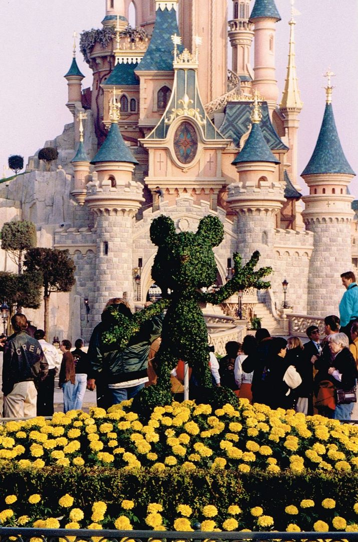 Sleeping Beauty Castle on April 12 with a Mickey topiary at the center of Central Plaza.