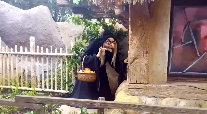 Chronologically speaking all the scenes are in perfect respect to the original movie storyline. In the movie the witch indeed appear at the cottage after Snow White dances with the dwarfs, so on this plan everything is right. In fact where the old dark ride was telling the Snow White story from the start to the end - in a way sometime too scary for very young children - the Seven Dwarfs Mine Train concentrate on the dwarfs themselves and the middle part of the movie. Still, it ends almost with a "cliffhanger" with the evil witch who as we know will poisoned Snow White anytime soon.