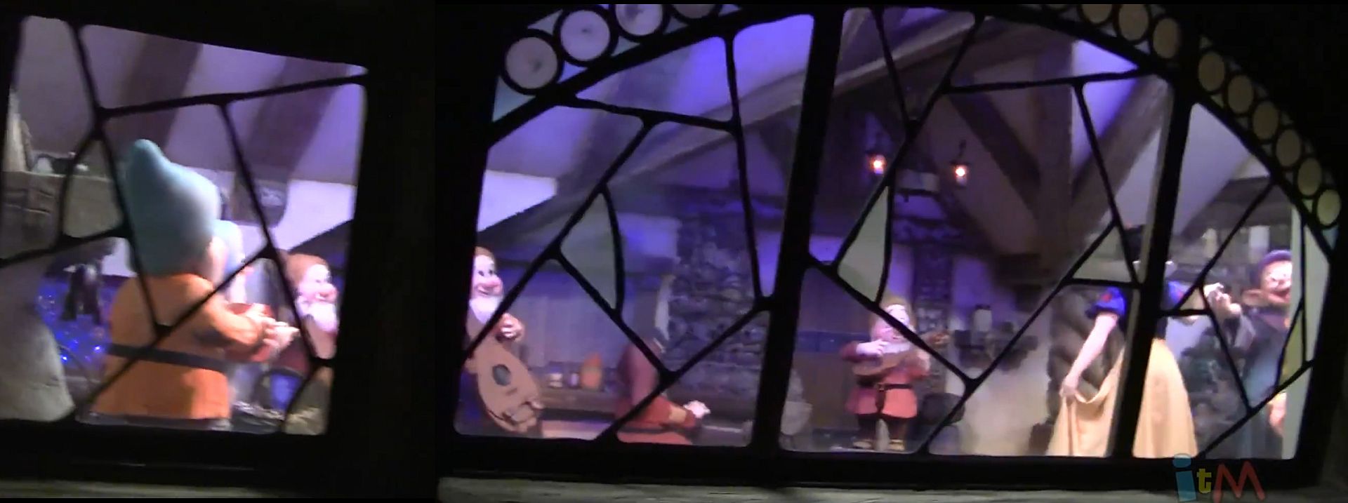 You've probably noticed that there is a little story in this ride. You see first the dwarfs at work in the mine, then it's time for them to go back home and i think the chinese shadows scene on the wall with them is a great idea, and it also legitimate why you can see them again dancing inside the cottage at the end of the ride as they went back home. And you even have the witch waiting its hour outside.