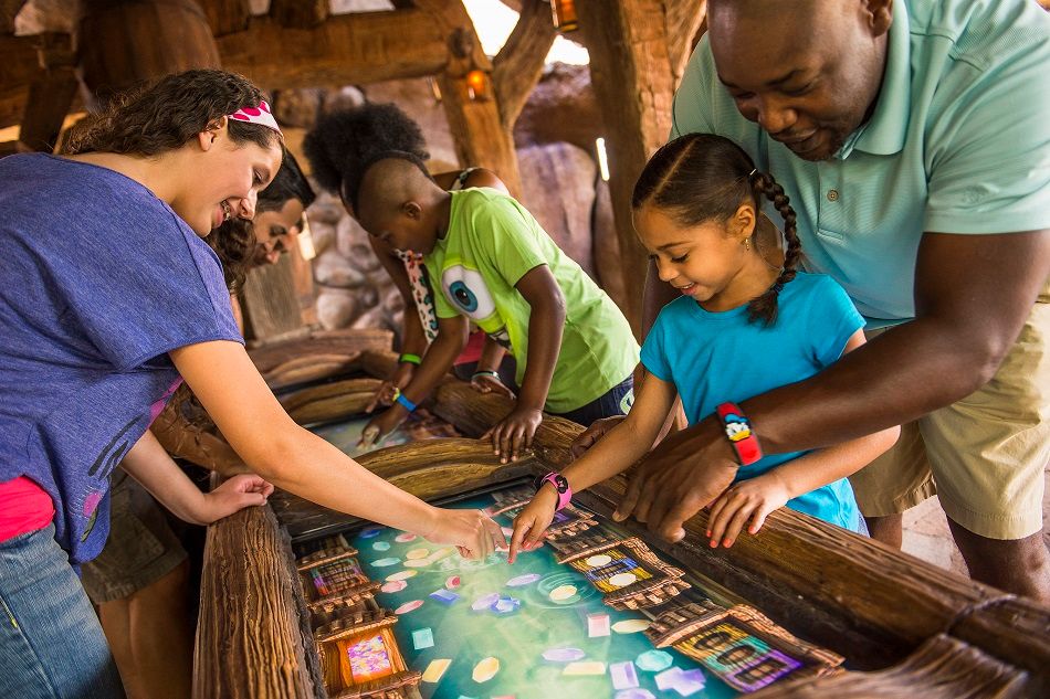 As you know there is an interactive queue and he first shot below shows guests at the first interactive station in the attraction queue, where Doc’s note explains the jewel washing game. As the jewels flow by in a wooden trough, or sluice, guests touch and drag them into a tray on the side of the sluice, matching them by color and shape. The trough is about 15 feet long and is accessible from both sides.