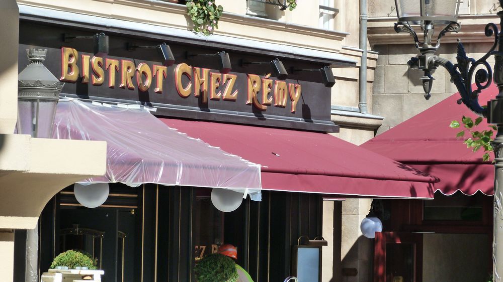 Some close shots on the "Bistrot Chez Remy" restaurant and the "Chez Marianne, Souvenirs de Paris" boutique awnings.