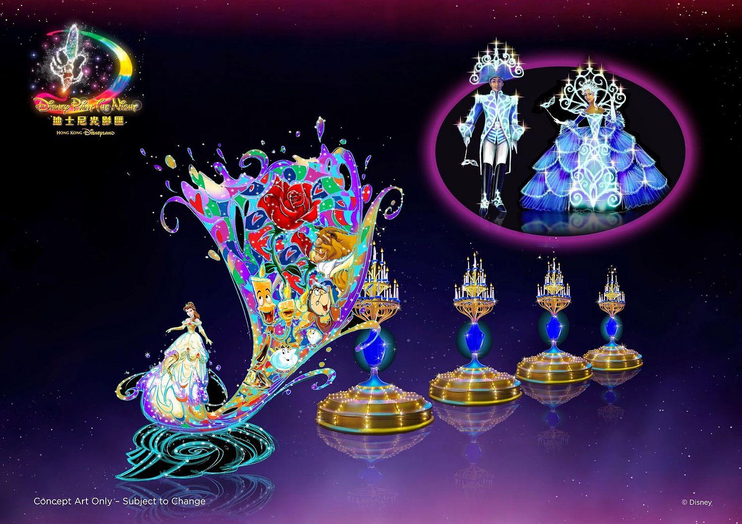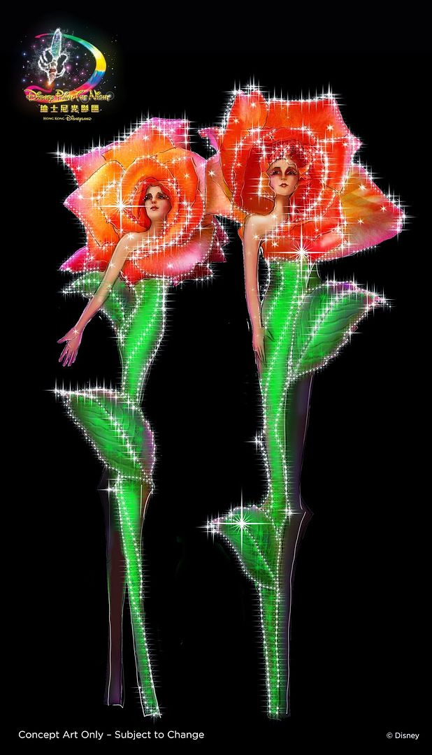 Above, concept Art for Belle Candlelight Unit: It’s the very first time that Hong Kong Disneyland will feature female performers on peg stilts as Rose Goddesses.