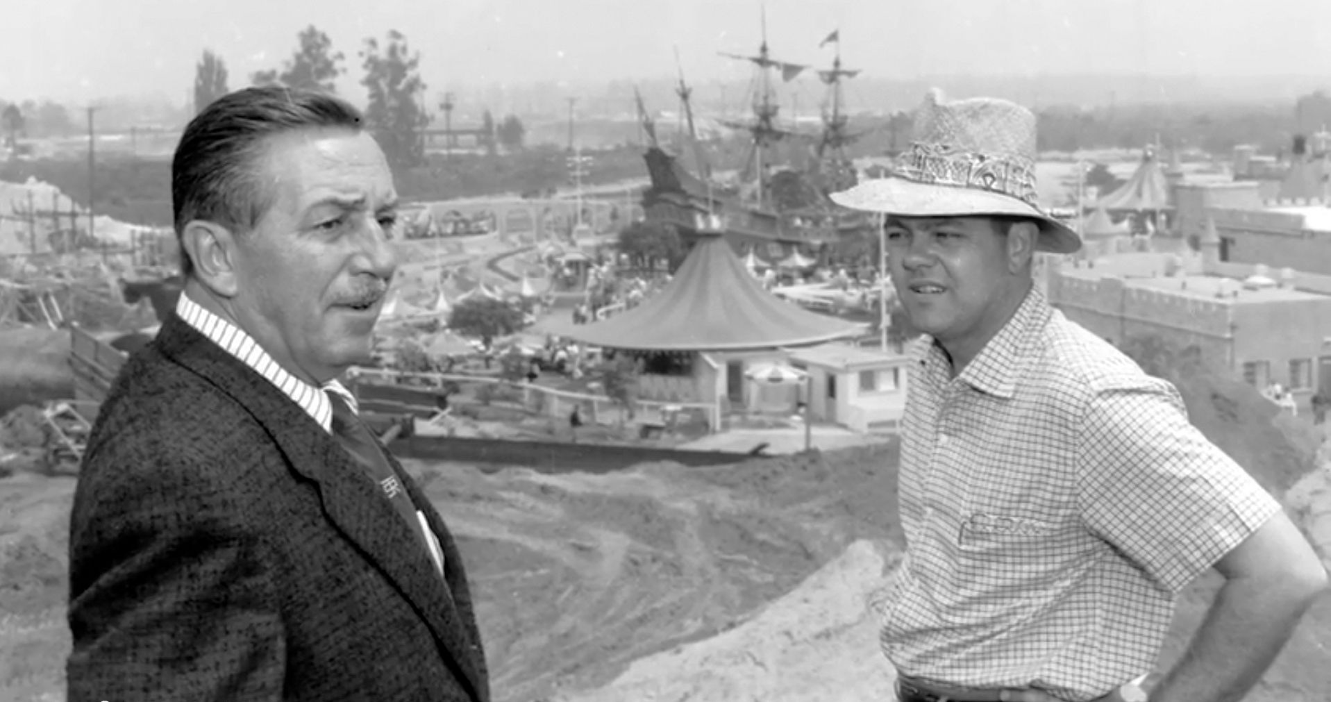 On the picture above: Walt Disney and Art Director and Disney Legend Bill Martin in 1956 standing on the construction site of Mine Train Through Nature's Wonderland. Just behind Walt's head, you can see the construction of the Skyway Fantasyland station.