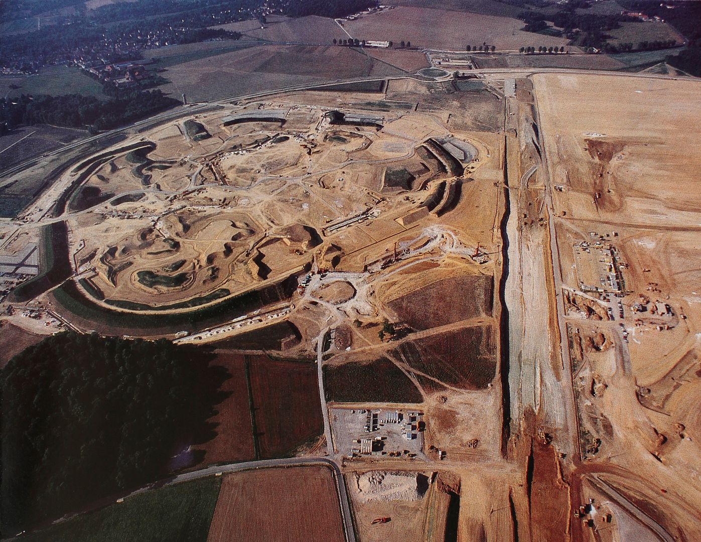 A rare aerial color picture showing the construction of Disneyland Paris at the very beginning. You already can guess the different lands.