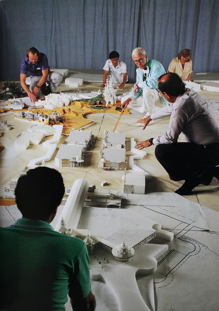 So let's start by the beginning, an when you create a theme park you must do artwork and models first ! On the picture above, Bob Fitzpatrick, first DLP CEO is here with WDI Imagineers and DLP early model - enlarge the picture to see the difference with the reality now, specially with the entrance and Disneyland Hotel.