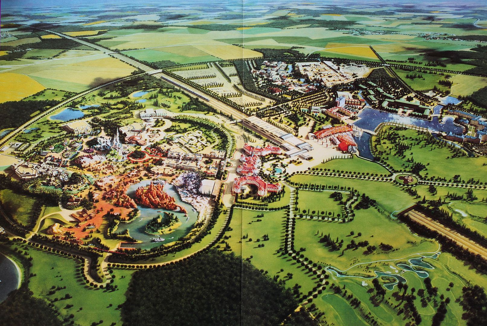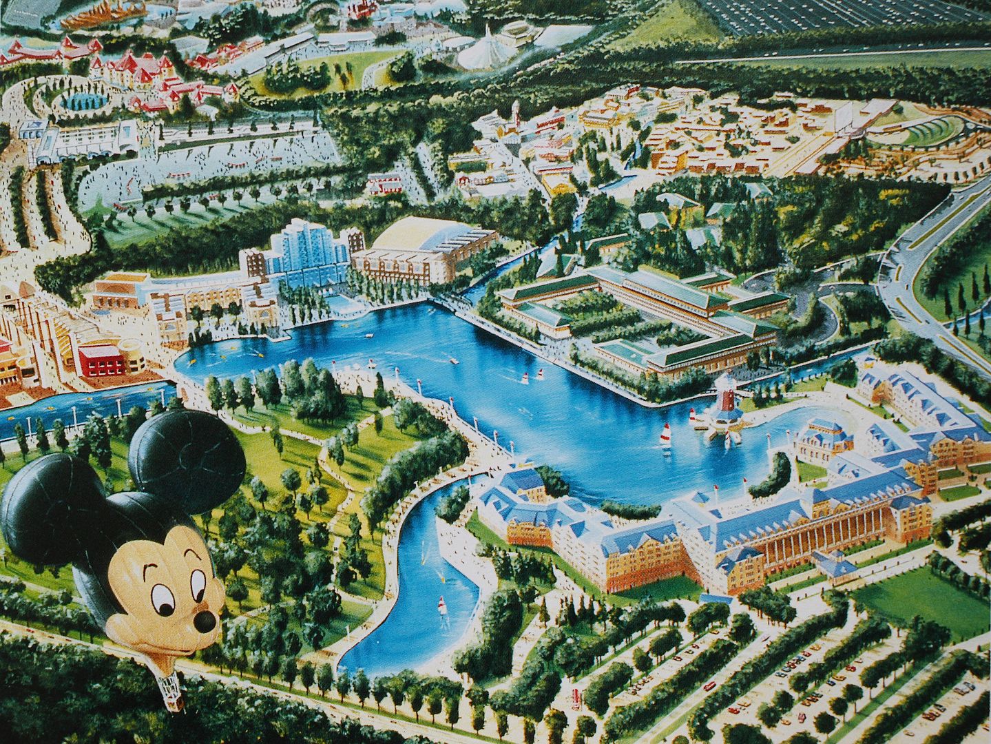 A fantastic artwork showing Disneyland Paris Resort in its final concept. Definitely click on it to see it in big size.
