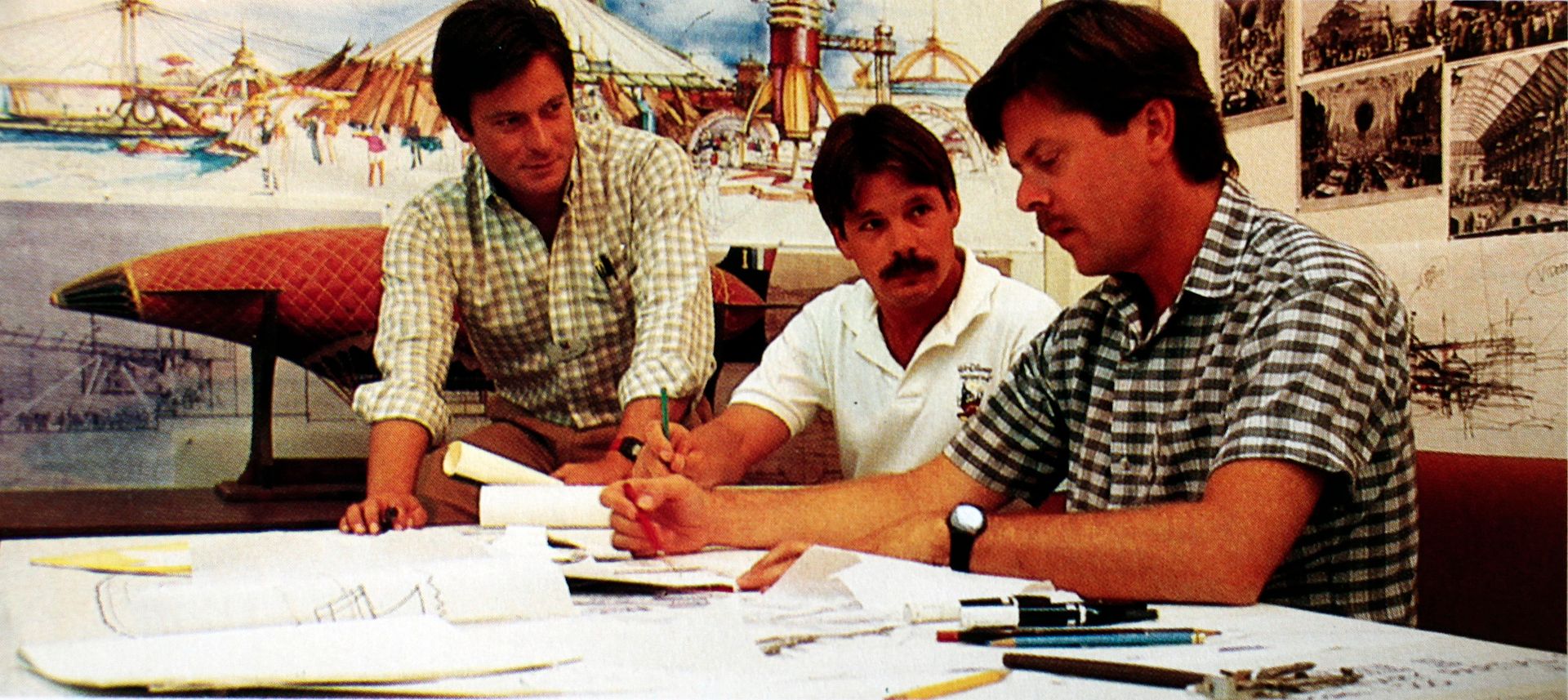 A rare picture of Imagineer and Discoveryland show-producer Tim Delaney ( front ) with two others WDI Imagineers working on the design of Discoveryland. Note the rare artwork of an early concept of Discovery Mountain, on the wall in the background.